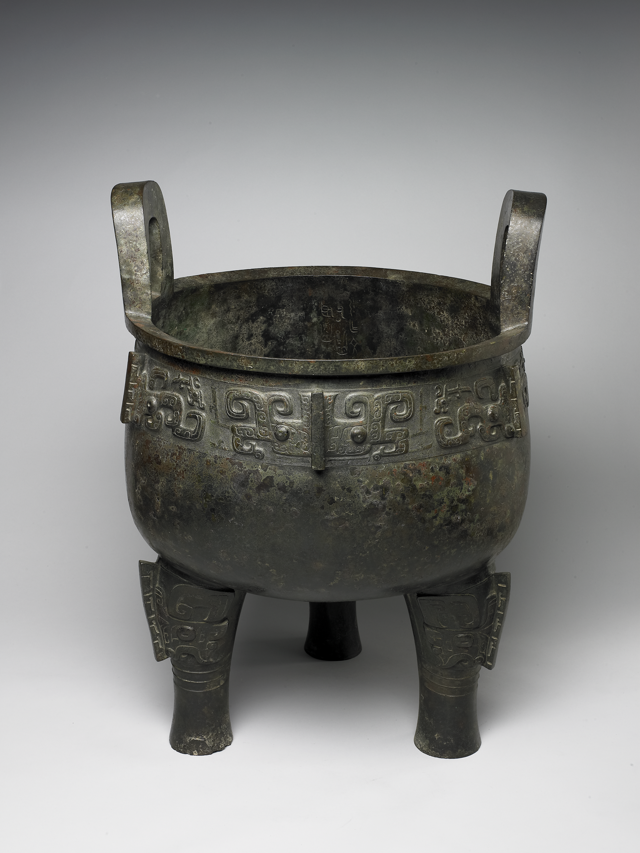 此三足圓鼎量體雄偉,形制典雅,紋飾線條流暢,是商晚期至西周早期(西元前13世紀-前10世紀)的典型大鼎樣式。由銘文內容可知此器的作器者□,為其父親「丁」所作的禮器。「□」為族氏銘文,「□」有兩說,一為屬於族氏銘文,另一說認為通假作「鑊」,「鑊」為器物名稱的專字,屬於鼎的別名。鑄有此族氏銘文的器物主要見於商末周初,數量不多。