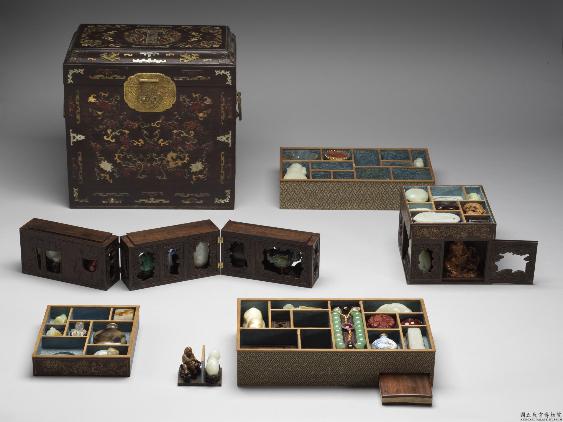 此紫檀木箱表面原鑲嵌螺鈿、蜜蠟、牙骨等多種材質(嵌件多處舊傷缺,經現代修補),其上原有題籤嵌件,然已佚失,無法確知作品名稱。箱內共收入珍玩57件:玉器30件、書畫4件、瓷器3件、琺瑯3件、漆器2件、銅器2件、竹雕4件、琥珀3件、玻璃1件、松石1件、瑪瑙1件、水晶1件、對數表1件與鍍金鼻煙盒1件。 箱內共分為三層,上方一、二層為長屜,最下方的第三層為兩個左右並列的方屜。屜內劃分為許多格層貯放珍玩。第三層的兩個方屜設計暗藏巧思,可再拆分為上層小屜與下層格子。兩方屜的上層小屜之屜內劃分為許多格子貯放珍玩,側面飾陰刻描金花卉紋。兩方屜下的格子飾有淺浮雕花木或博古紋樣開窗,但兩者設計不同,分別是方形格子與折疊式格子。方形格子側面為側拉式開窗格架。折疊式格子由三個長方形開窗小格串連與折疊而成,並以小卡榫固定格子四面的開窗板。此箱內部屜層設計樣式多元且暗藏玄機,極具巧思。