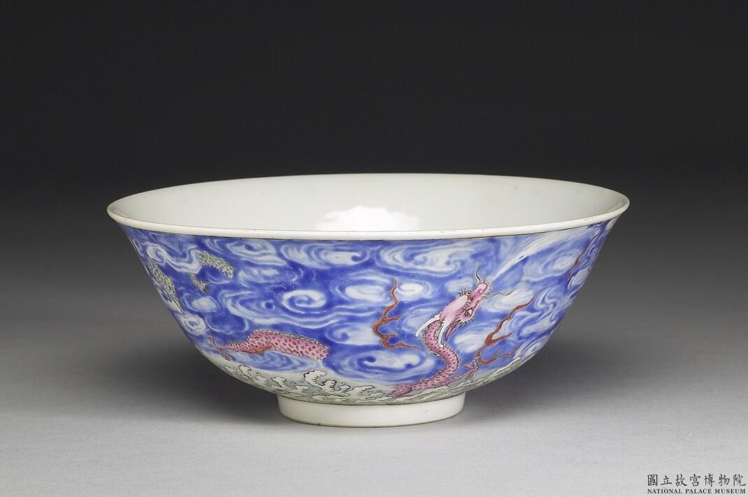 此對琺瑯彩雲龍紋碗色澤艷麗,黃、紅、綠龍穿梭在藍天白雲及波濤之間,配色特殊,主要紋飾幾無二致,僅碗心荔枝及葉片佈局略異。荔枝為琺瑯彩及洋彩器上較為少見的裝飾。琺瑯彩瓷是盛清代表工藝之一,乾隆朝是琺瑯彩瓷發展的成熟階段,此二器品質精美,繪製細膩,且或為《活計檔》中紀錄的「磁胎法瑯山水雲龍碗一對」,益顯珍貴。