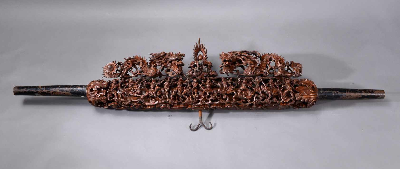 在一般情況下,宜蘭地區的北管軒社由前至後出陣陣列的順序為:頭旗及燈托、牛舌旗、三角旗、菜刀旗、彩牌、鑼槓、北管武場樂手、鼓架、北管文場樂手、春榭、神轎、壓帆旗,鑼槓即位於樂隊的最前方,以其嘹遠響亮的樂音先聲奪人。 本件鑼槓兩端呈橫長之圓柱狀,方便扛工扛抬施力,槓身中段裝飾帶兩端雕飾以莨苕葉紋,拱映著中間繁盛緻密、以「內枝外葉」多層次手法雕製的戲齣,其中正面傾力造作《封神演義》第八十四回「三教大會萬仙陣」之戲文,可見原始天尊(騎龍)、燃燈道人(騎鹿)、道德天尊(騎牛)居左,與右方截教人士鬥陣的盛大場面;背面則雕鏤「哪吒鬧東海」,可見於東海戲水洗澡的哪吒居於最左,上身坦裸,正擲出乾坤圈迎戰龍宮太子(騎獅)、墨魚精、魚精和蚌殼精等一干水族。正反兩面戲齣人物多穿插牽帶雲紋或海潮紋,既保留器型輪廓的完整、避免凹陷失材,又可強化造型支撐力度不致因雕鏤過細而殘損,從中可見匠師雕作布局的高超技藝和智慧。鑼槓上方另外以鐵釘固著有「雙龍護珠」雕件,以一對雲龍一左一右拱護著正中央之寶珠,托襯寶珠的下方雲紋正面雕有「總蘭社」三字,彰示器物所屬;龍頭並轉首前視,與陣頭行進動線一致,極富生動氣勢。桿身正中央下方露出鎖固之金屬掛勾,用以懸吊大鑼。 資料來源:國立傳統藝術中心