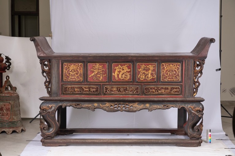 神案桌面以兩片木板拼接而成,兩邊翹首以插榫方式固定於桌面。正面有上五面下三面,共八面垛子,垛子上方以減地方式陽刻紋飾,分別有螭虎團字紋「福」、「祿」、「壽」三字團龍字,下方為獅戲球等動物紋樣,兩側角牙則裝飾卷草紋,立水做透雕束草紋,前方兩腳為螭虎吞草,下有托泥,托泥下有扁足。背面無封板,雙側皆有兩根棖子加強結構,桌面底下可見五根插榫,垛子背面也有木榫。 經鑑定分析得知:本神案之結構桌腳、雕刻插角皆使用樟木,顯示臺灣淺山、平地盛產之樟木,取材容易,富含精油、比重中庸,又便於加工,為優質的雕刻材料。