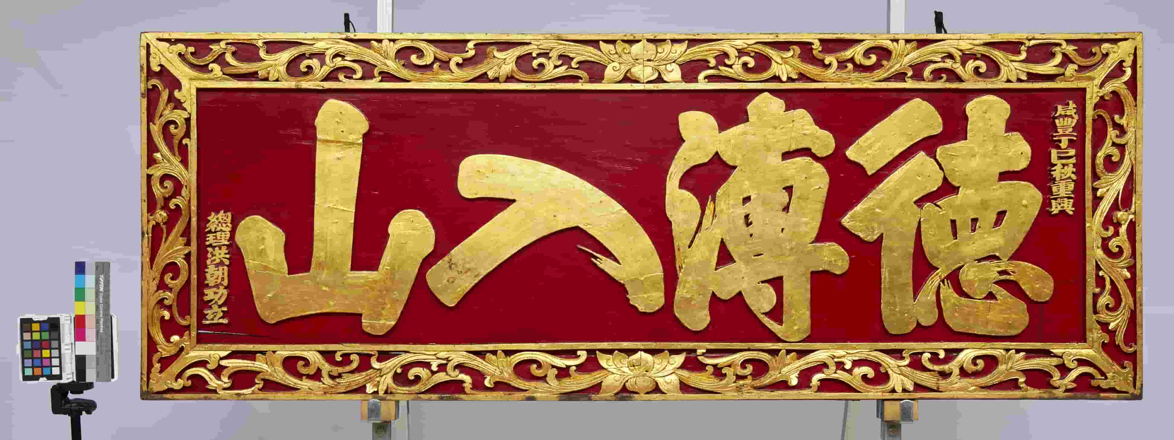 「朝陽宮德溥入山匾額」乙件,匾板為楠木,匾框為牛樟木,屬於木作工藝,型制為素線匾,匾托方斗形,固定於壁體。懸掛於朝陽宮正殿。匾心由單塊板與匾框組合,匾地上朱漆作為紅地,匾文及上下款文字皆作金字,漆層有重新上漆,未明初始狀態。匾框以攢邊框工藝接合,可見平頭榫,表面剔底雕作蓮花卷草紋樣,頂部有片狀鐵加工成吊環(工匠稱之為屈戌兒),以供懸掛。背面可見匾框以攢邊框工法組合,並作穿帶2條,並與匾框相合。 該匾為清咸豐7年(1857年)由總理洪朝功敬獻,反映草屯第一座媽祖廟及觀音信仰的地方事蹟。匾文「德溥入山」,以「德」為題含意,突顯敬奉觀音佛祖信仰,與媽祖海神的特質,如同「德」可「配天」,譬喻觀音佛祖信仰與媽祖護佑信眾恩德,可與上天相提並論。「入山」則是指,進入南投北投街,寓意觀音佛祖信仰,傳播至內山。 上款文:「咸豐丁巳秋重興」,下款文:「總理洪朝功立」。本件文物具上下款,為地方仕紳獻匾,顯示草屯地區鸞堂宗教信仰與開發史的實證,且字體大方宏偉,周邊紋飾工巧,有藝術性。