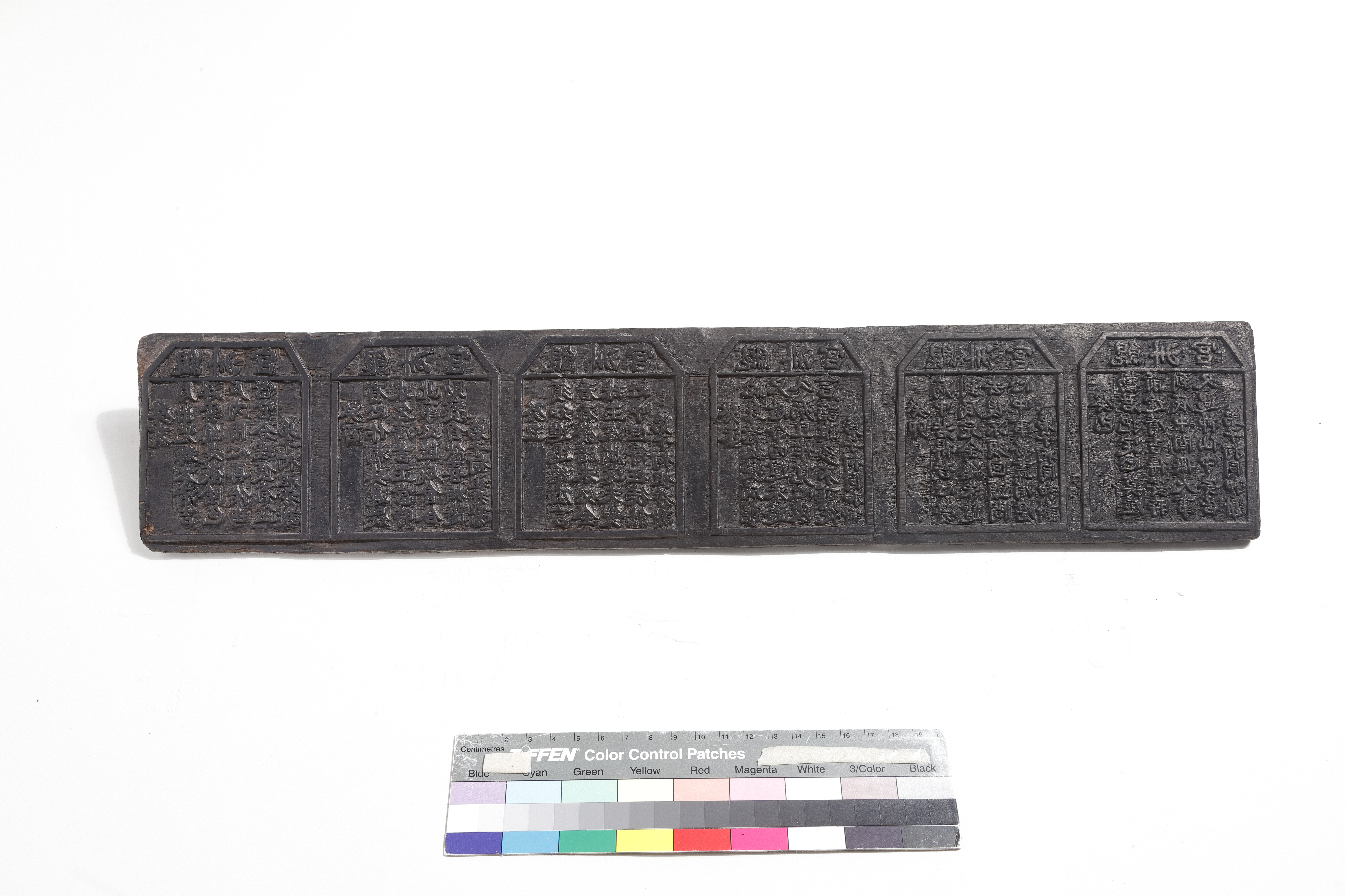 此組5件六聯幅雙面淺浮雕樟木印版,版面保留有用於量測固定文字定寬的縱向斜口刀切痕,和三角刀挖空背景的「V」形鑿痕,浮雕印版木基底狀況佳,邊角線框有破損,表面有灰塵堆積與黑色印墨及蟑螂卵鞘。