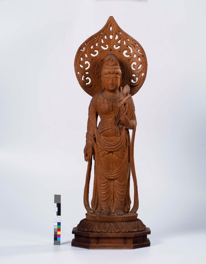 1.此尊木質觀音像於1955年1月25日隨玄奘靈骨來臺,為全日本佛教會代表團贈送給中國佛教會之贈禮,1956年1月22日中國佛教會將其迎送至獅頭山勸化堂安奉,能反映戰後中日兩國間的政治互動與文化交流。 2.觀音立姿,面部圓潤、表情莊嚴,雙眼微張,額頭有毫光,頭戴正面刻有小尊化佛之頂冠,左手持未開蓮花,右手持與願印。雕製工藝精美,為出身日本琦玉縣且曾多次入選日本美術展覽會的著名佛師立川金祿刻製。 3.此尊觀音像與臺灣其他擁有日式觀音的形象不同,是「正觀音」。為日本知名佛師立川金祿所造,其作品曾入選日本美術展覽會24回,藝術成就可從其多件作品贈送外國可見。