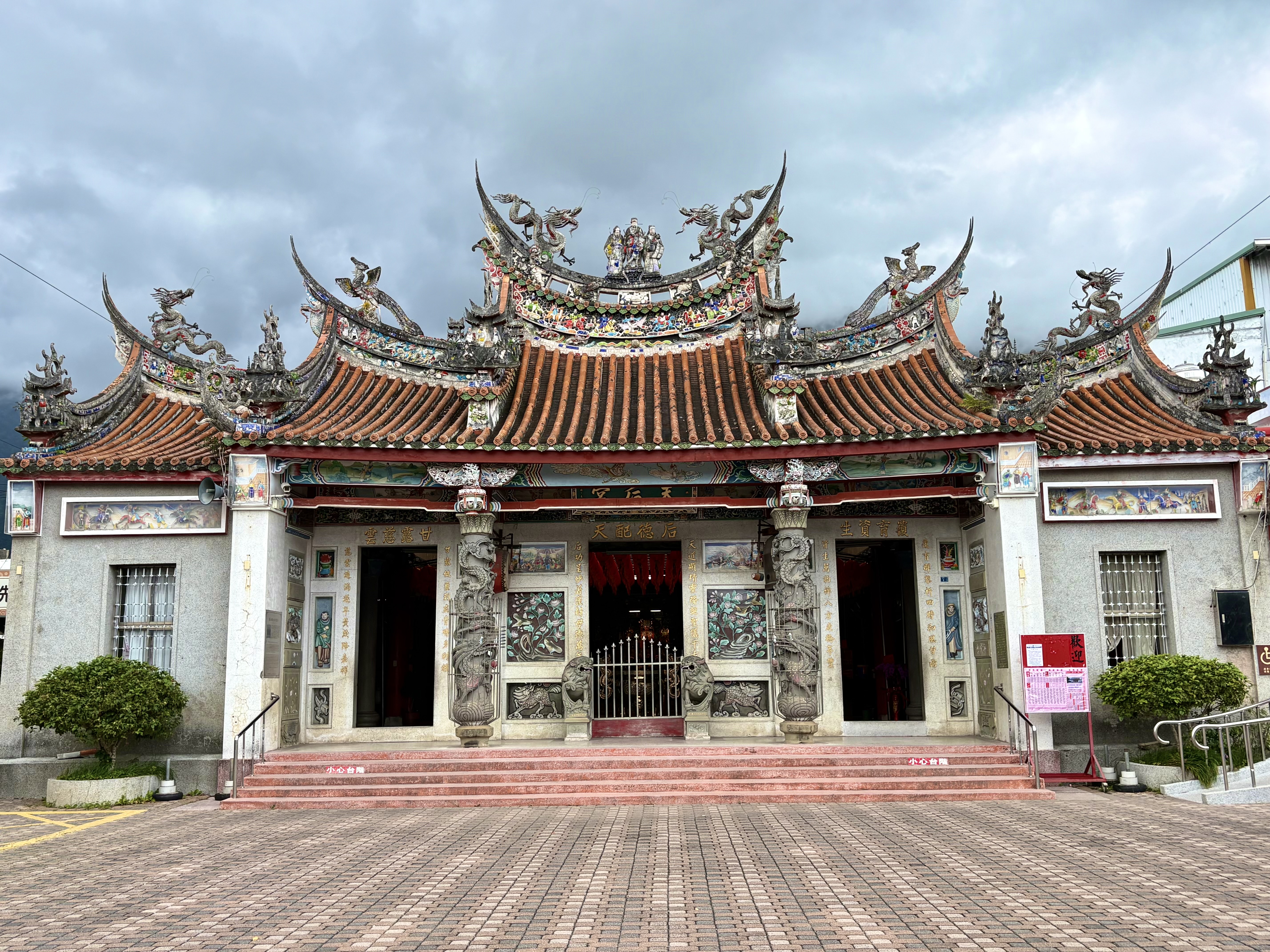 閩南式燕尾翹脊造型之雙殿二進式建築,以磚造水泥建材,營造出類似傳統寺廟木造建築的風格。 中軸分金線角度略呈東南走向,與市區東西向道路大致平行。中軸分金線上包含正殿供奉媽祖金身所在的明間、中埕的供桌、三川殿的廟門與天公爐、中華路牌樓,形成本廟的空間軸線,全廟的建築結構與裝飾在此中軸線二側呈現對稱性的分布。正殿與三川殿之明間、次間與梢間的屋面依次抬高,屋脊做燕尾造型,飾以龍、鳳、寶塔、三仙與花卉等剪黏,營造出高低錯落與華麗繁複的屋頂天際線,充分顯現閩南式廟宇建築屋頂華麗繁複的特色。(提報表)