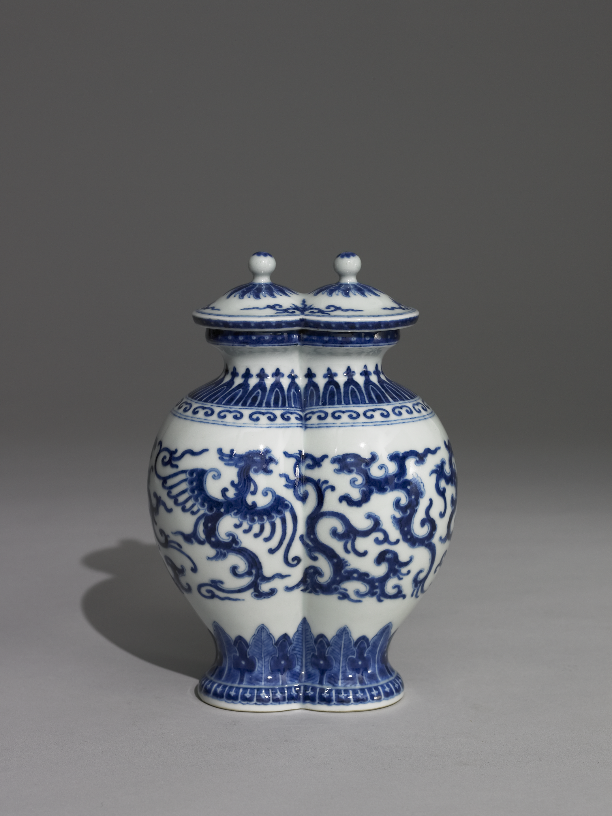 雙連蓋罐,豎唇口下斂,短頸,豐肩,圓腹,內凹圈足,帶球鈕笠頂雙連子母口蓋。外壁以青花為飾,腹部兩面各繪一對夔龍鳳紋,線條流暢;頸肩部飾蕉葉紋及如意紋;蓋鈕繪朵花紋,鈕下圍一圈蕉葉紋,外側分列四卷葉紋,蓋沿繪雙圈弦紋邊飾。底有青花書「大清乾隆年製」六篆字款。 清宮舊藏。