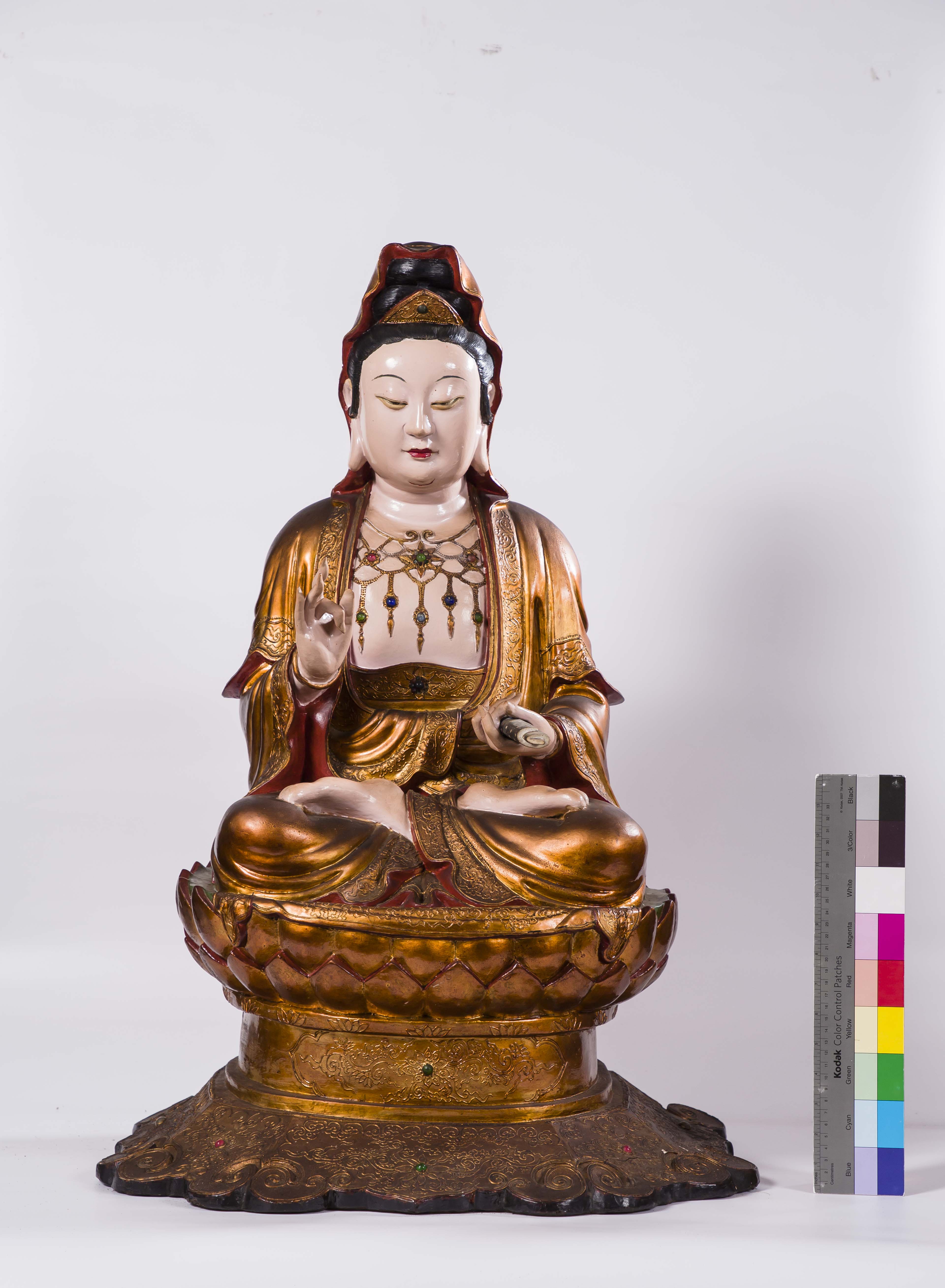 觀世音菩薩神像:縱85m×寬53㎝×深50㎝ 普賢菩薩神像:縱77cm×寬70㎝×深60㎝ 文殊菩薩神像:縱77cm×寬76㎝×深60㎝ 韋馱護法神像:縱81cm×寬32㎝×深32㎝ 伽藍護法神像:縱78m×寬32㎝×深32㎝
