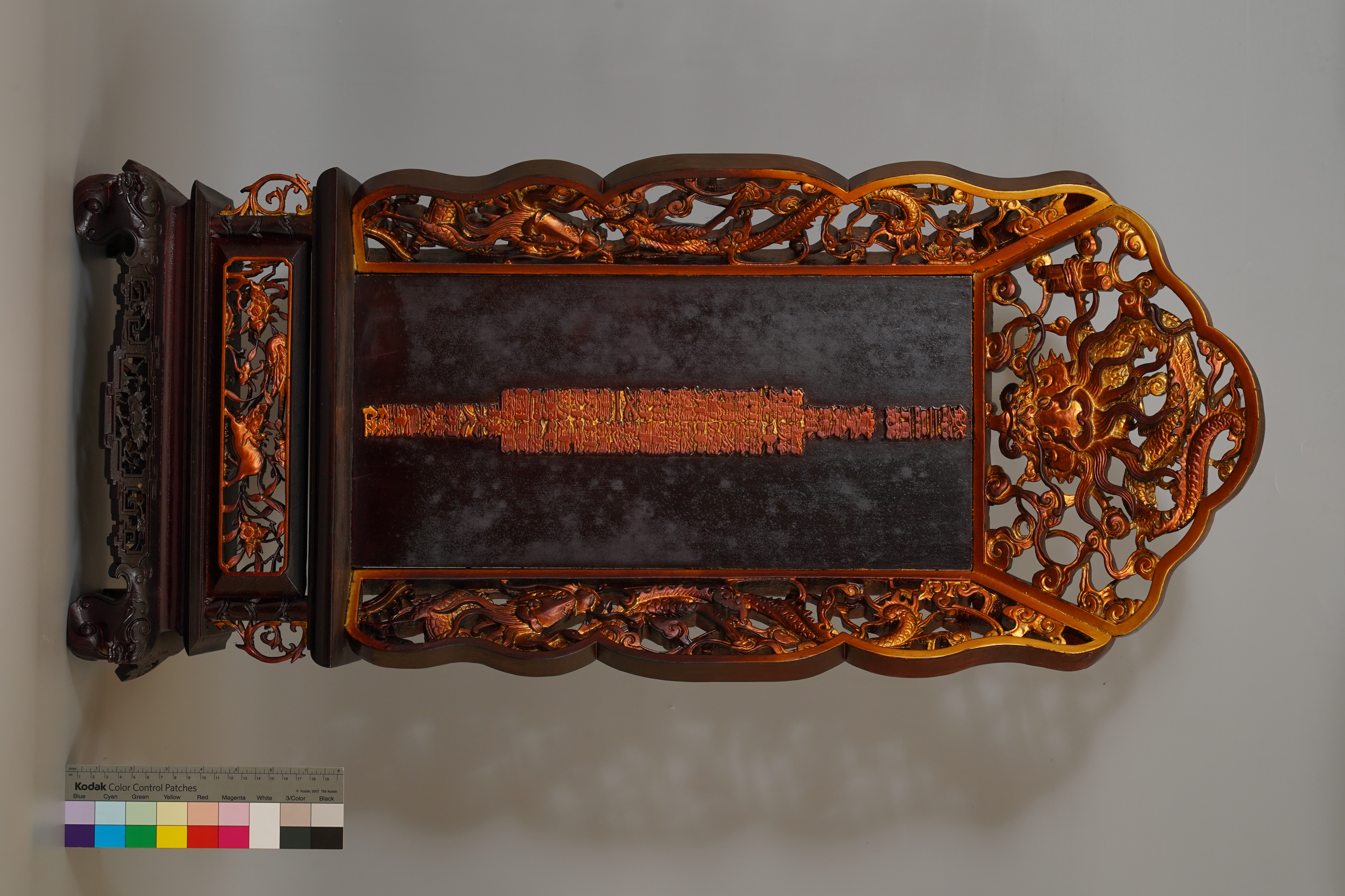 林朝棟統領長生祿位,高87、寬37、深19公分,此面祿位由多部件所組成,上方為透雕團龍雲紋,兩邊為透雕龍紋,中間以老宋體字體雕刻「欽命二品頂戴 賞穿黃馬褂 督辦中路營務處中路撫墾事務統領棟字建屯諸軍遇缺儘先前選用道兼襲都尉又一雲騎都尉勁勇巴圖魯 林大人朝棟公長生祿位」。觀察上面的字體,係以整塊木料雕刻後,以鐵釘固定於面板之上。祿位中堵為透雕麒麟花鳥紋裝飾有竹節雕刻,堵四邊凹痕中可見螺鈿痕跡,兩邊插角為卷草紋,下方為螭虎足並透雕回字牡丹紋,因常年供奉煙燻,雖已經經過重漆整修,但仍可見到表面燻黑痕跡。 大湖萬聖宮「林朝棟統領長生祿位」因重新塗裝完整,無合適檢測點進行木材、漆層等檢測與判讀,僅能透過X光確認其內部結構組成方式。 本次針對大湖萬聖宮牌位進行X-Ray結構檢測,透過不同灰階影像檢視文物內部結構與製作工藝,並且進而輔助判斷材料工藝組成、劣化或特殊隱藏等現象。大湖萬聖宮牌位,未見底座無任何釘子固定,四面雕刻裝飾面板皆以拚舌板的榫接方式組合,而牌位與底座則以平榫接合。另外牌位三邊裝飾板以手打釘固定。由上述整體結構組成方式大致可確認此牌位雖外表重新整理與塗裝,但仍為舊件,大致可推至約20世紀初以前之物件。