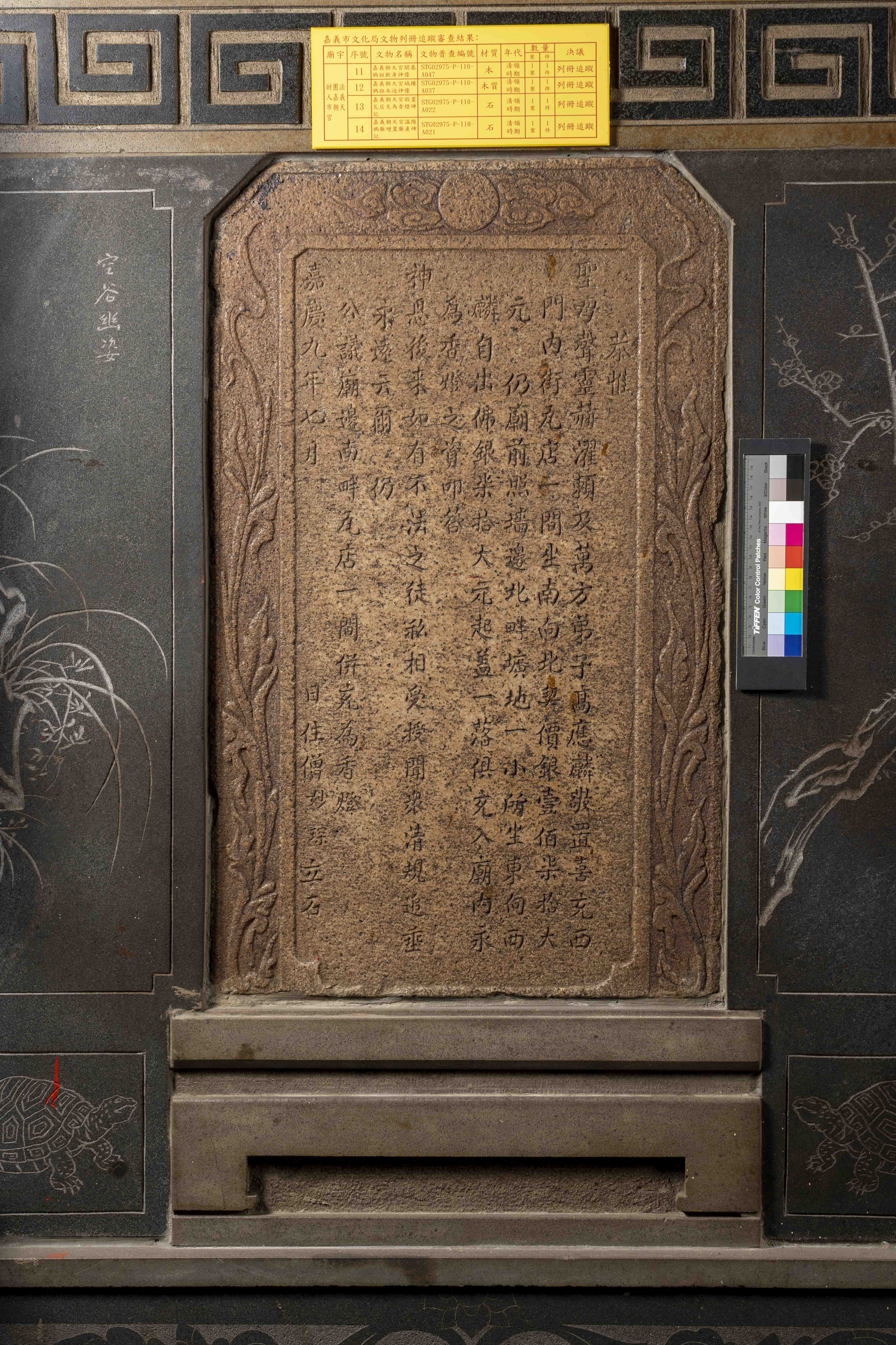此碑為長方形,頂端成圭形,採減地雕法,留有內外兩層邊框,框間左右為浮雕捲草紋,頂端中央則為浮雕彤日祥雲紋。邊緣有些許碰撞缺損痕跡,碑面中央為直書陰刻碑文,由上而下,由右至左,內文為: 「恭惟 聖毋聲靈赫濯 賴及萬方 弟子高應麟敬置喜充西門內街瓦店一間 坐南向北 契價銀壹百柒拾大元 仍廟前照墻邊北畔壙地一小所 坐束向西 麟自出佛銀柒拾大元 超蓋一落 俱充入廟內 永為香燈之資 叩答 神恩 後來如有不法之徒 私相受授 聞眾清規 追垂永遠云爾 仍 公議廟邊南畔瓦店一間,併充為香燈 嘉慶九年七月 日 住僧妙琛立石。」 此碑現鑲嵌於璧內,與壁面平齊,底下有一底座,但石質與石碑明顯不同,為後加。
