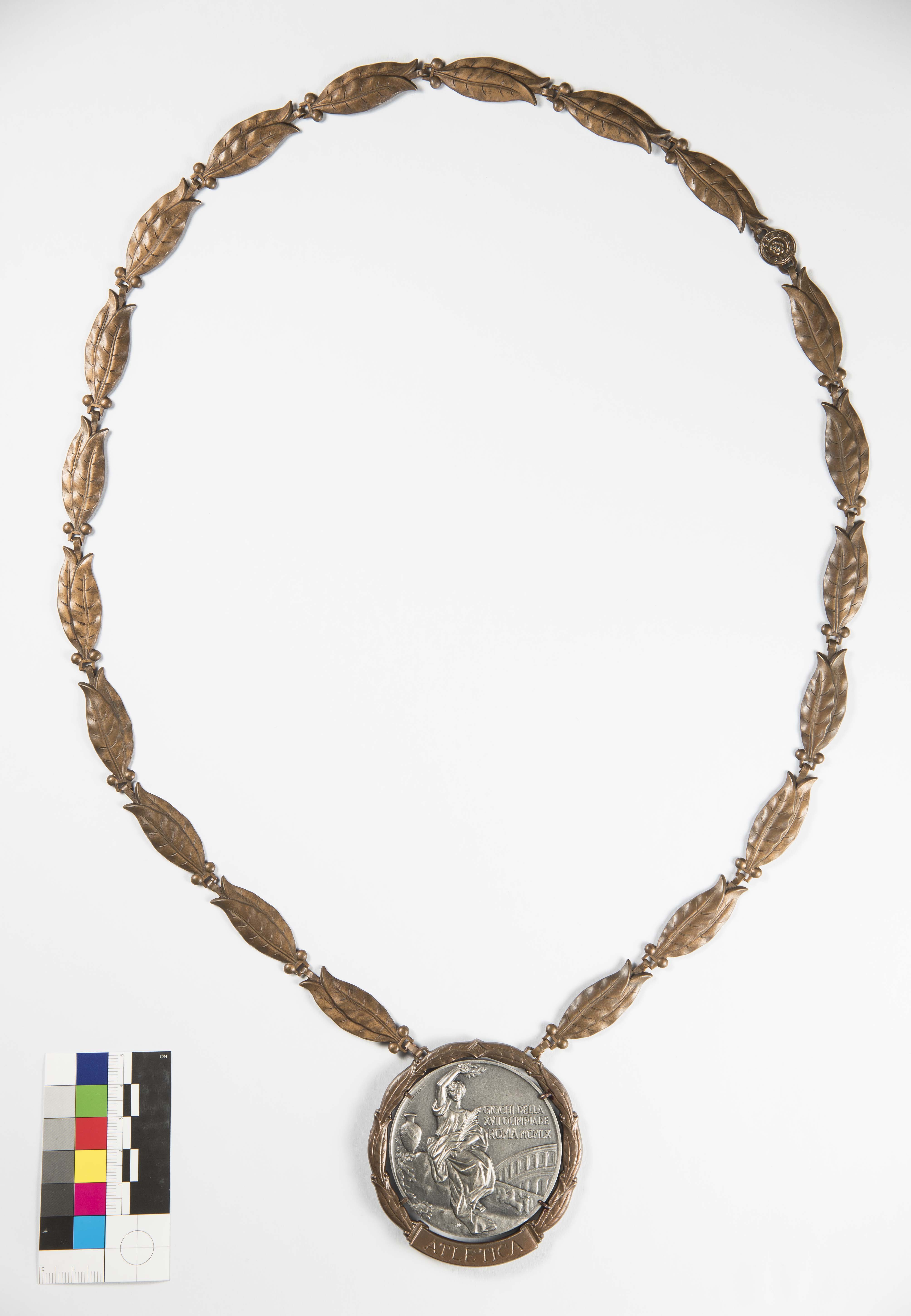 銀牌直徑7cm、厚0.73cm,銅質外框厚0.41cm,鍊長85cm 、鏈上葉片長4.12cm、寬1.43cm