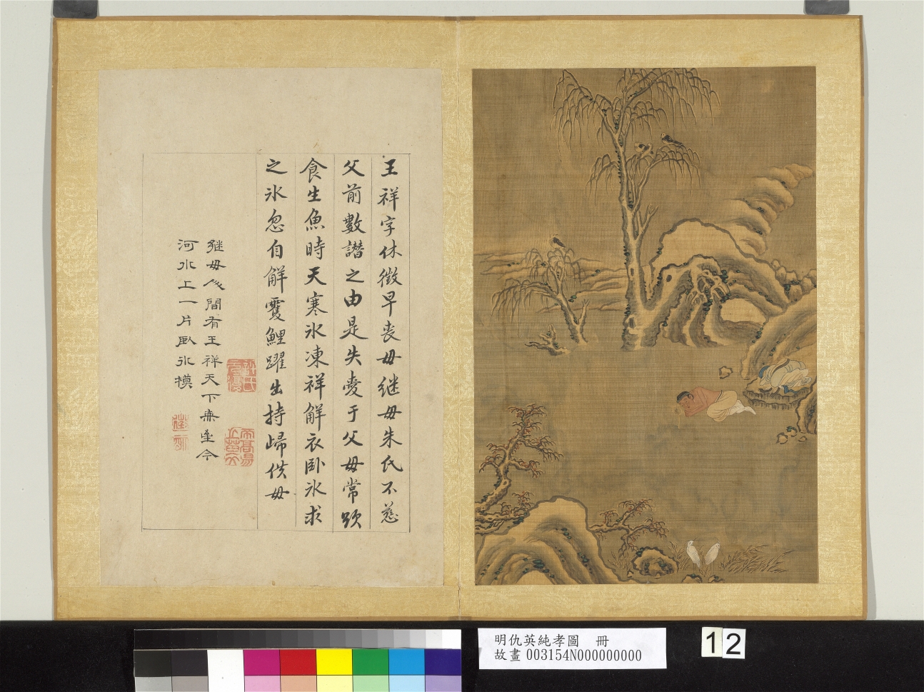 這套冊頁以每開為一單元的方式,畫二十四孝的故事。各開中右圖左文,圖選擇以故事中的一段主要情節為主題,末幅有明四大家之一的仇英(約1494-1552)的款印,但應為後人所作。第十二開描繪二十四孝中王祥臥冰求鯉的孝行故事,人物刻劃細緻,能反映明清時期對二十四孝的認識與表現手法。