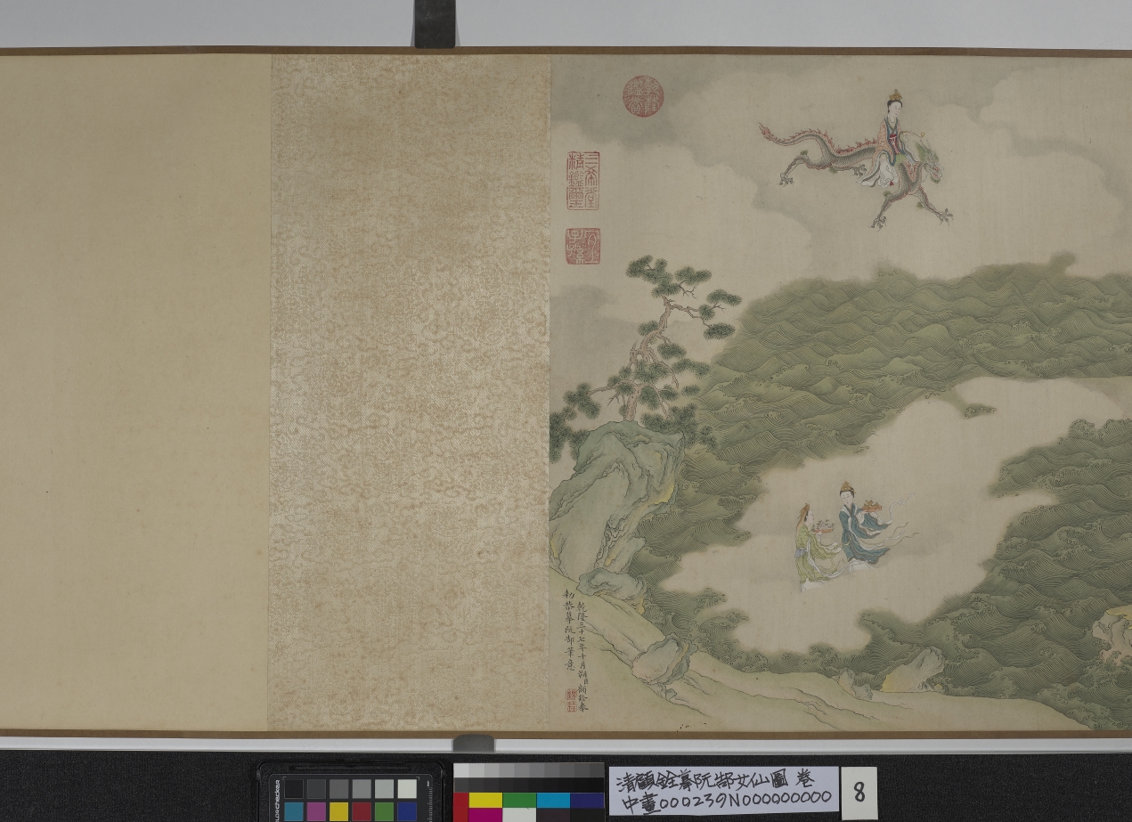 波浪翻湧,島嶼浮空,眾女仙騎麟駕鶴而來,島上松木蓊鬱,居中女仙執筆欲書,一旁女仙彈阮,面前的鸞鳳也相應起舞,旁侍女仙則備茶與桃果。此畫作於清乾隆卅七年(1722),款署「奉敕恭摹阮郜筆意」,所摹為傳五代阮郜的〈女仙圖〉(現藏北京故宮博物院)。