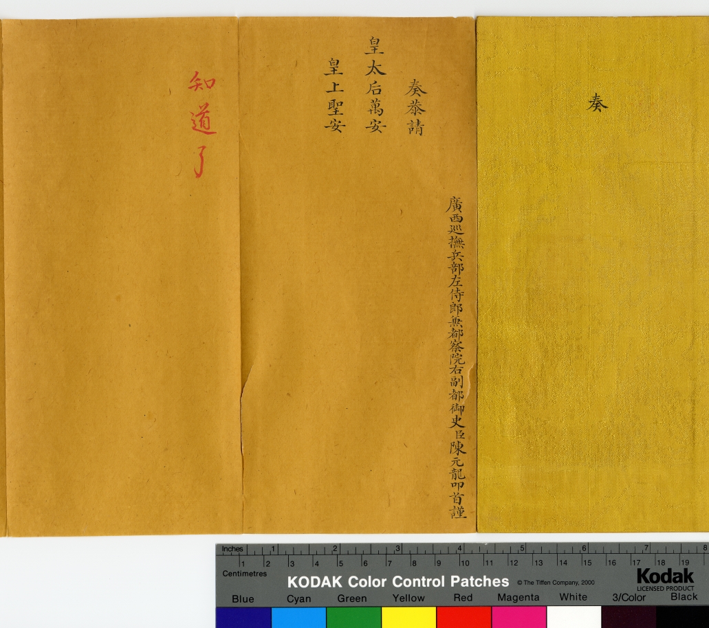 本件為康熙年間廣西巡撫陳元龍向皇太后、皇帝呈遞的請安摺,摺封採用雙面繡織手法,突顯雙龍搶珠明暗效果。陳元龍出身浙江海寧陳家,康熙皇帝南巡浙江,曾多次駐蹕陳家,又曾在1700年(康熙三十九年)應陳元龍之請,御書「愛日堂」三字製成匾額賞賜陳元龍,可見君臣之間的情誼深厚。
