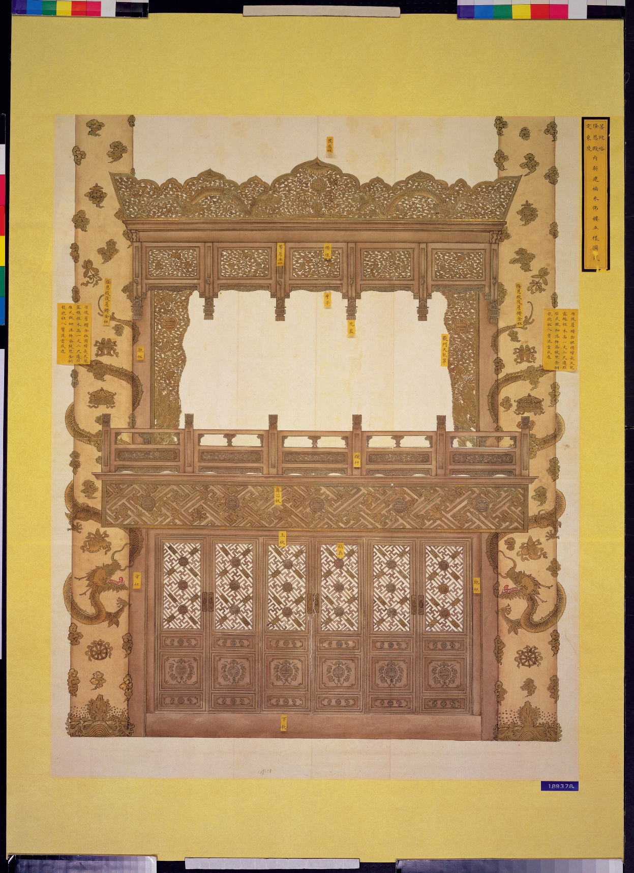 文物名稱原為〈普陀峪隆恩殿定東陵內新建楠木佛樓立樣圖式〉,是屬於軍機處奏摺錄副〈奏為遵旨恭修佛樓敬擬做法繪圖貼說並請欽派大臣勘估錢糧以應工需摺〉(故機190315)的附圖之一。普陀峪定東陵,是慈禧太后死後陵墓。始建於同治十二年(1873),勵光緒朝繼續修繕擴建,耗銀超過200餘萬兩。工程規模之大、用料之考究與富麗程度,僅次於清高宗乾隆皇帝裕陵。宣統元年(1909)10月初3日,慈禧太后正式入葬地宮後,同年11月隆恩殿東暖閣又動工興建佛樓。此圖即當時東陵守護大臣等人描繪的建築圖式。圖內佛樓分上下兩層,左右兩根柱子設計雕縷兩條盤龍,威嚴壯觀。以龍圖騰裝飾女性太后佛樓的設計,這是清代絕無僅有的例子。而從其建築圖式及繪製技法,精巧絕妙,極有可能是清宮著名的雷氏家族「樣式雷」設計圖樣之一。