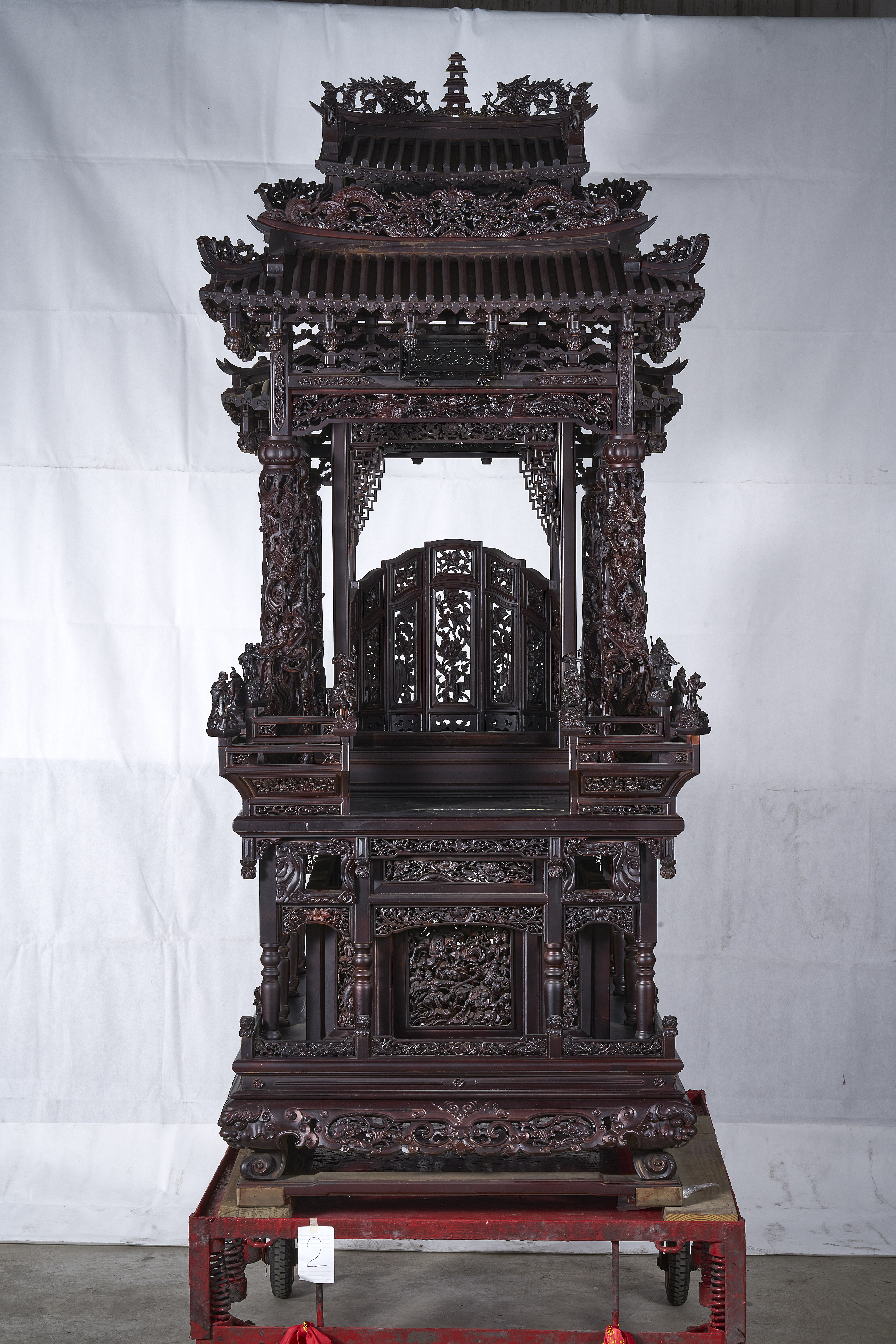 1.採四角形結構,整體依寺廟建築形制分為轎頂、轎身、轎裙、轎底,四面開窗,使媽祖出巡時能從不同角度被觀看,呈現莊嚴威儀。 2.轎頂為歇山重簷,雕有「雙龍拜塔」、「雙鳳朝牡丹」、螭虎等傳統吉祥圖案,並運用臺灣珍稀木材「赤皮」與「烏心石」雕刻。轎身裝飾「二十四節氣」、戲曲與歷史故事題材,結合西洋列柱與傳統拱圈,展現日治時期獨特的木雕風格。 3.神轎由四個「螭虎吞腳」支撐,確保結構穩固,並以四邊形托泥隔離地面,保持通風乾燥。歷經歲月洗禮,民106年曾整修,至今保存良好,仍持續參與「海表聖會巡安賜福遶境」,展現媽祖信仰的文化傳承。