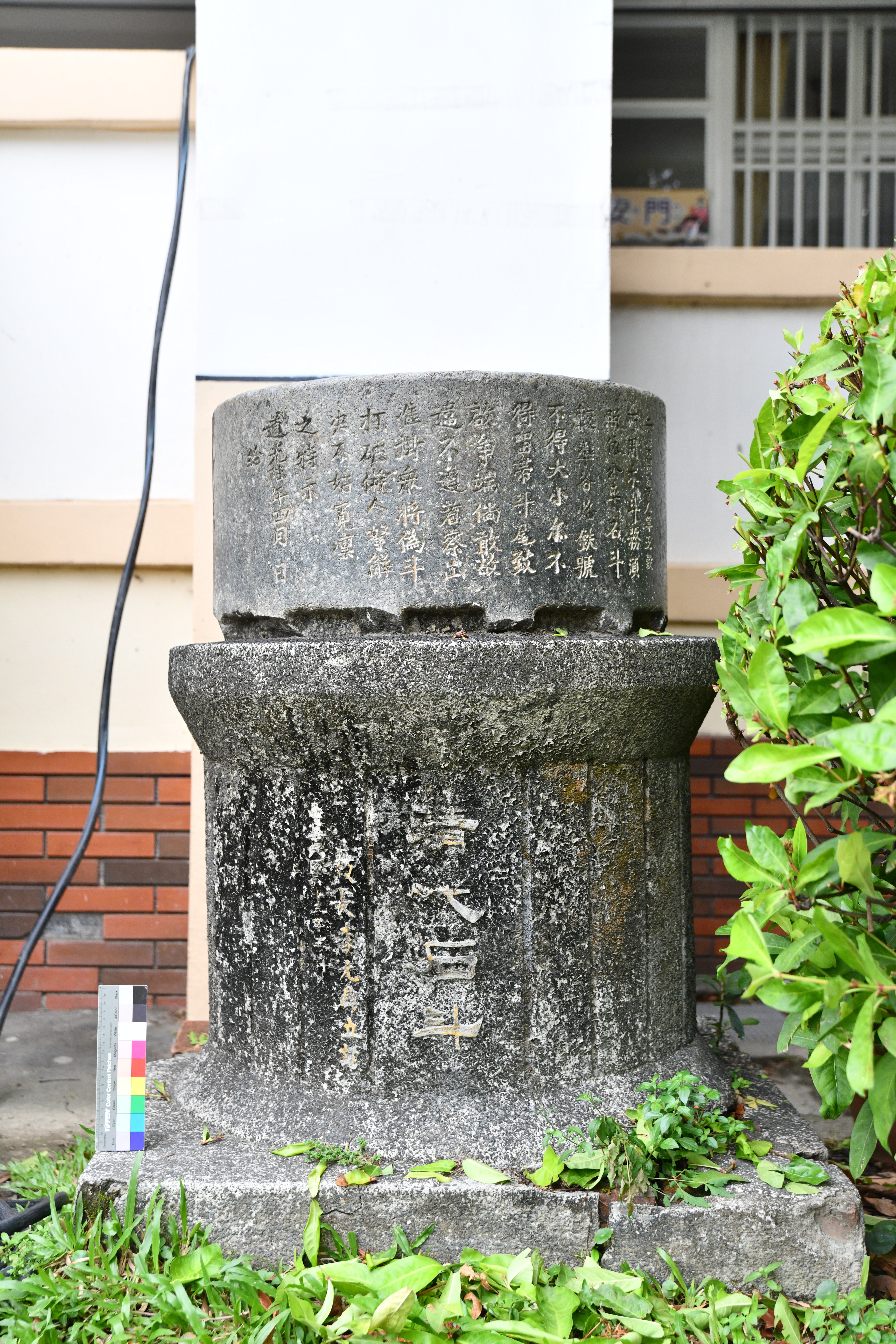 清代公定公斗量碑,製成於1826年間(道光6年),由鳳山縣知縣杜紹祈明訂民間斗量器具之標準,以威嚇偽斗,維繫交易之公平性。現碑記本體為花崗岩,基座為混凝土。