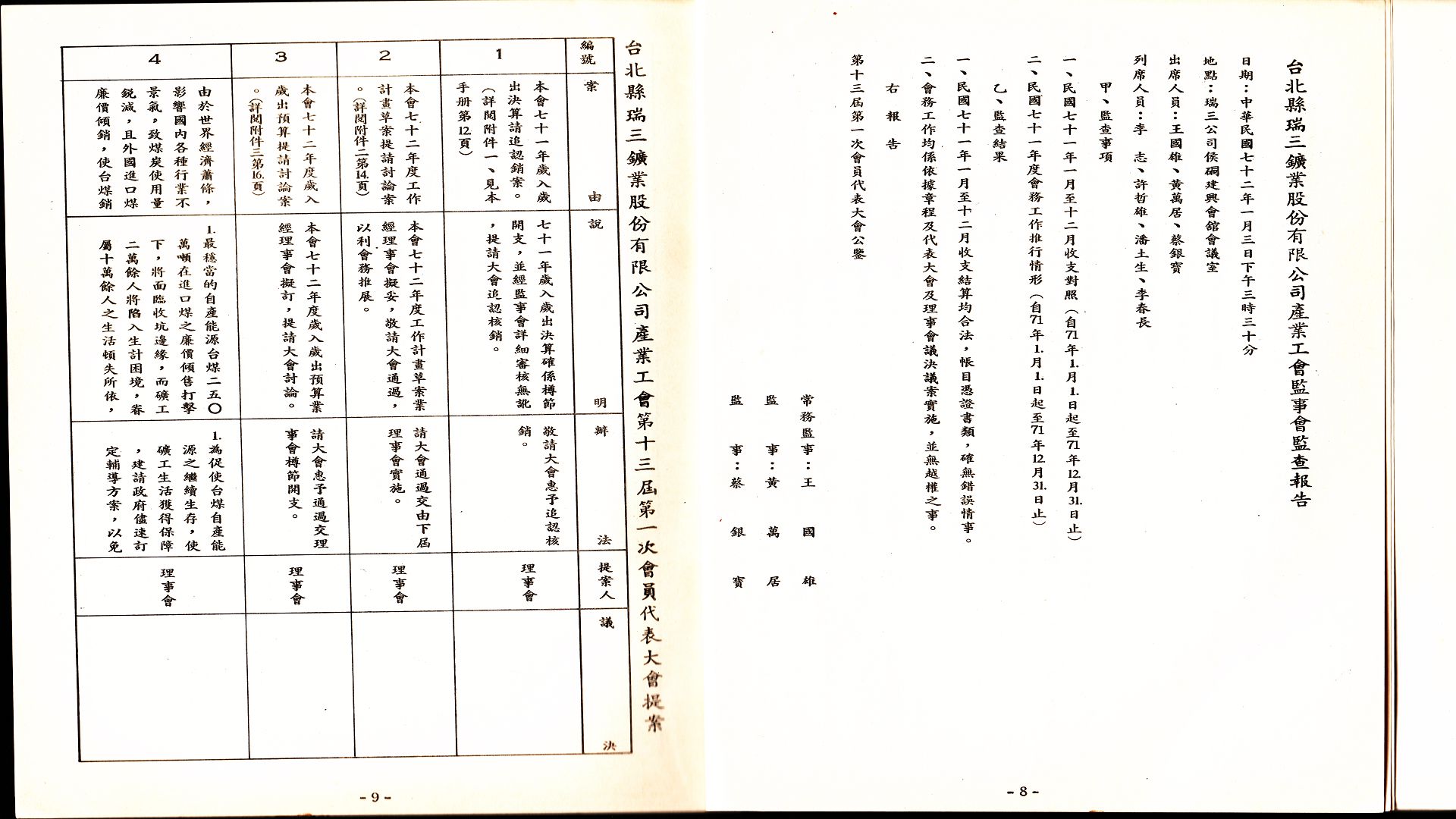 台北縣瑞三鑛業股份有限公司產業工會於民國72年1月18日,於台北縣侯硐礦場之介壽堂,舉辦瑞三工會之第三十屆第一次會員代表大會。