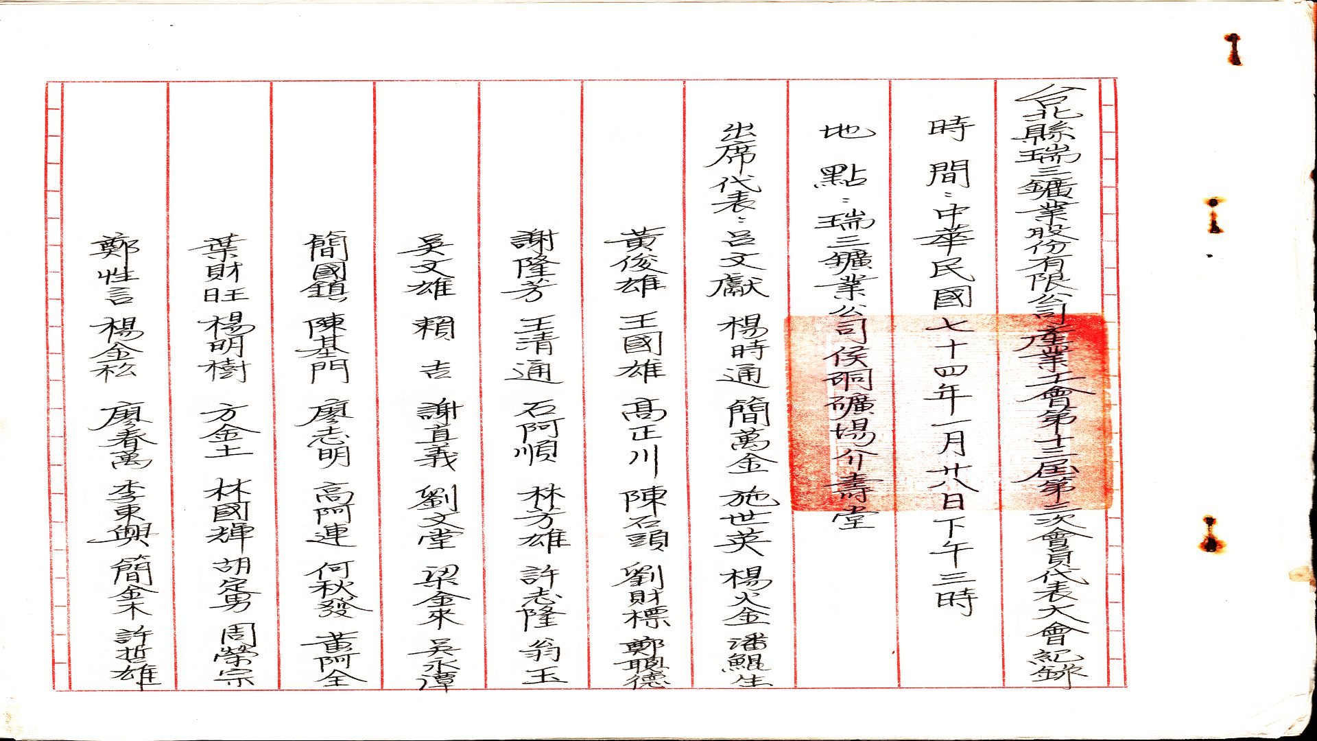 民國74年1月28日,台北縣瑞三鑛業股份有限公司產業工會第三十屆第三次會員代表大會,於侯硐礦場介壽堂舉辦。