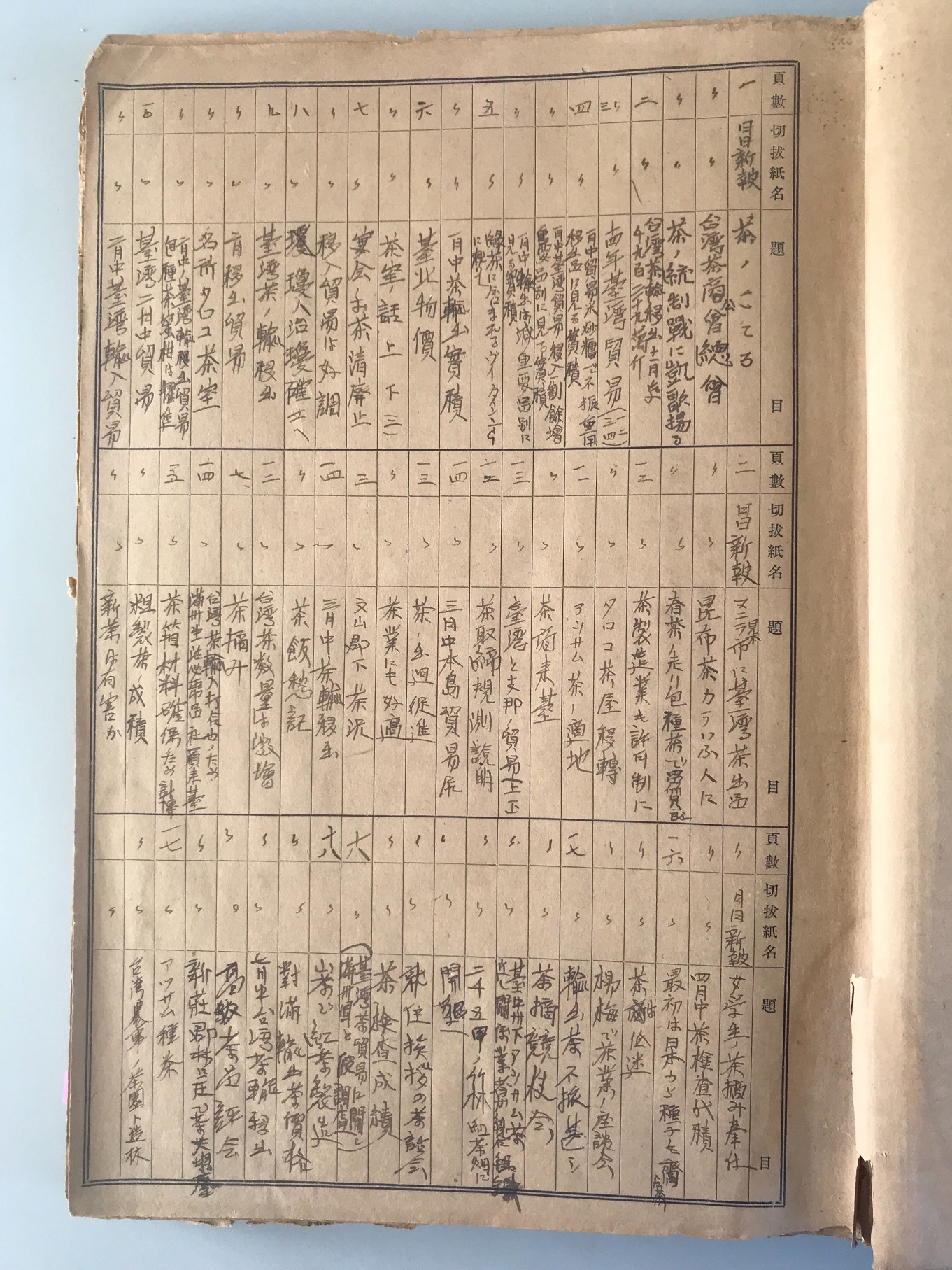 此為昭和15年(1940)任職於魚池分場製茶課長朱湧岳先生,蒐集昭和15年(1940)至昭和20年(1945)日治後期,臺灣日日新報茶產業相關領域的新聞報導、評論、專論、趣聞…等資料,剪貼成為剪報資料供業務參考之用,剪報內容篇幅共有18頁,主題資料有62篇,蒐集者完整呈現出1940年代國內外茶產業相關訊息,有助於茶業研究後輩們探究40年代日治後期的茶業歷史人文脈絡、田間管理措施、茶業製造、茶業政策擬定、茶業最新等之時事動態。