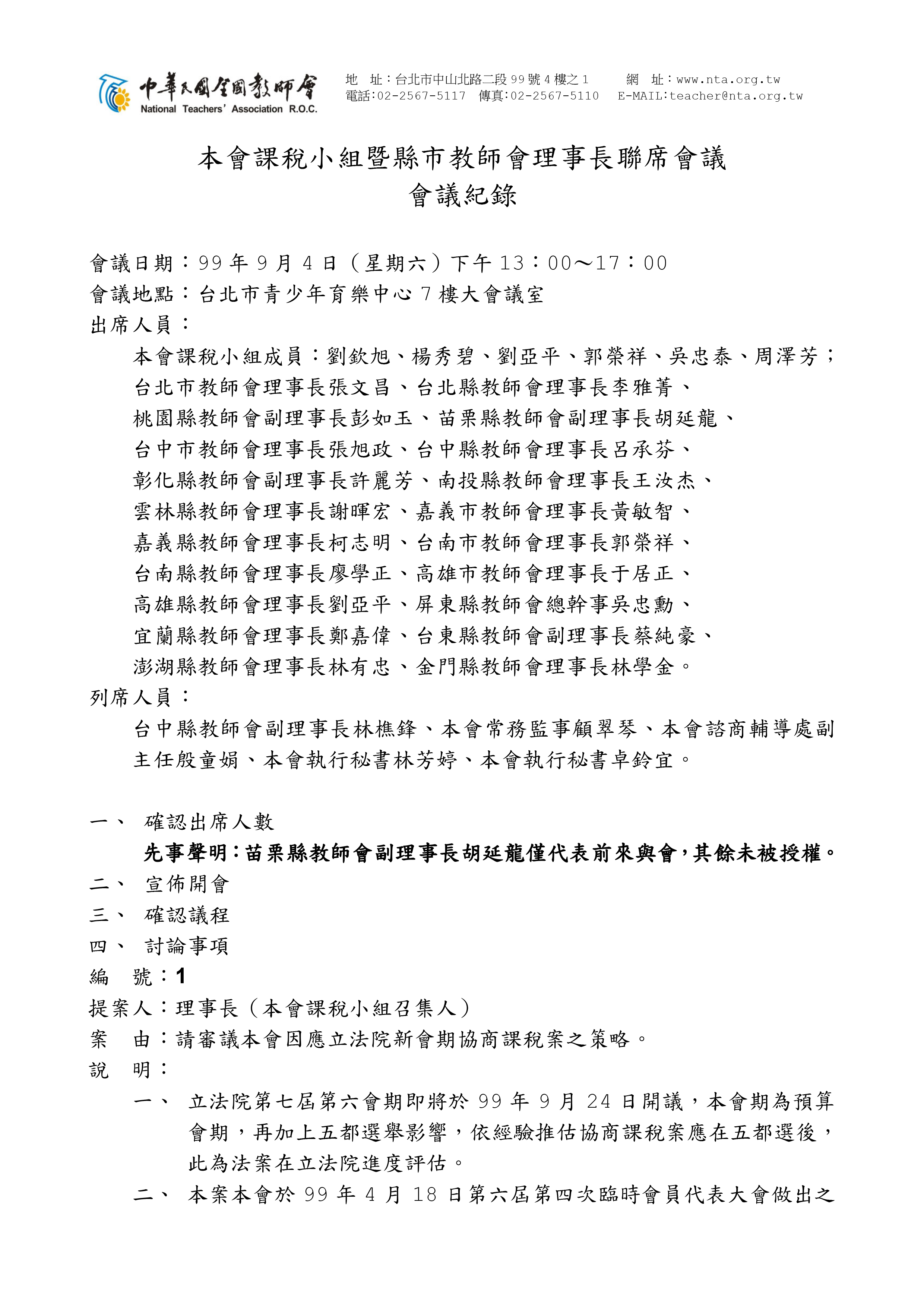 20100904全國教師會課稅小組暨縣市教師會理事長聯席會議紀錄