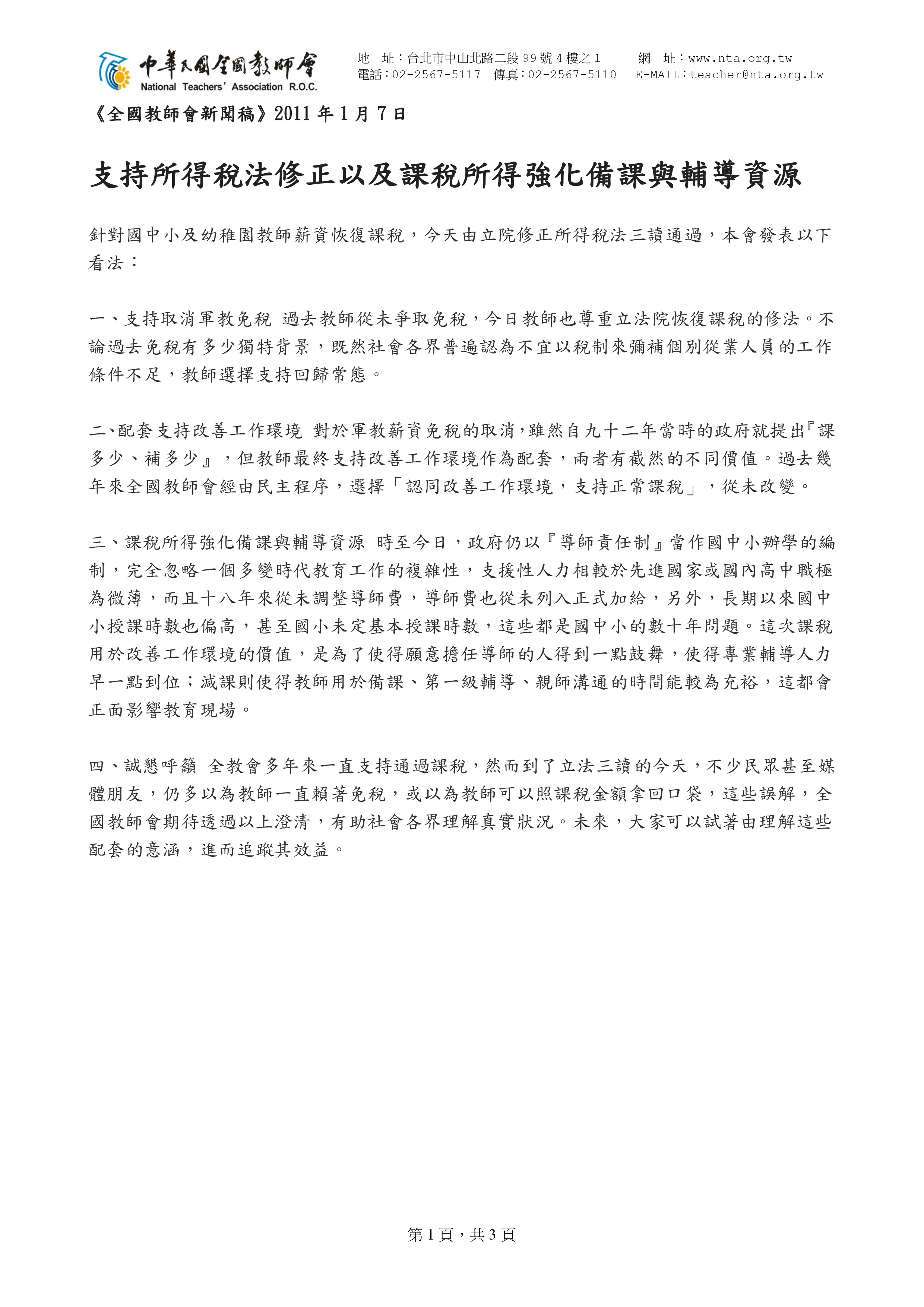 針對國中小及幼稚園教師薪資恢復課稅,2011年1月7日立法院修正所得稅法三讀通過,中華民國全國教師會(簡稱全教會)發表以下看法:一、支持取消軍教免稅:過去教師從未爭取免稅,今日教師也尊重立法院恢復課稅的修法。二、配套支持改善工作環境:對於軍教薪資免稅的取消,雖然自2003年政府就提出「課多少、補多少」,但教師最終支持改善工作環境作為配套,兩者有截然的不同價值。過去幾年來全教會經由民主程序,選擇「認同改善工作環境,支持正常課稅」,從未改變。三、課稅所得強化備課與輔導資源:這次課稅用於改善工作環境的價值,是為了使得願意擔任導師的人得到一點鼓舞,使得專業輔導人力早一點到位;減課則使得教師用於備課、第一級輔導、親師溝通的時間能較為充裕,這都會正面影響教育現場。四、誠懇呼籲:全教會多年來一直支持通過課稅,然而到了立法三讀的今天,不少民眾甚至媒體朋友,仍多以為教師一直賴著免稅,或以為教師可以照課稅金額拿回口袋,這些誤解,全教會期待透過以上澄清,有助社會各界理解真實狀況。
