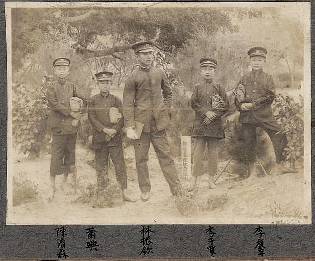 本照片為五人於戶外所拍攝。下方題有個人姓名,由左至右分別是陳清森、蕭興、林振欽、李于買、李庚辛。中間林振欽穿著與其他四人不同,制服略有不同,手上拿著書本。推測可能是老師或學長,帶領四位學生戶外學習。四位學生皆頂戴制帽,穿著形式類似官服或陸軍服的學生制服,手上帶著包袱(可能是包便當)。特別的是長褲下未穿鞋子,打著赤腳。