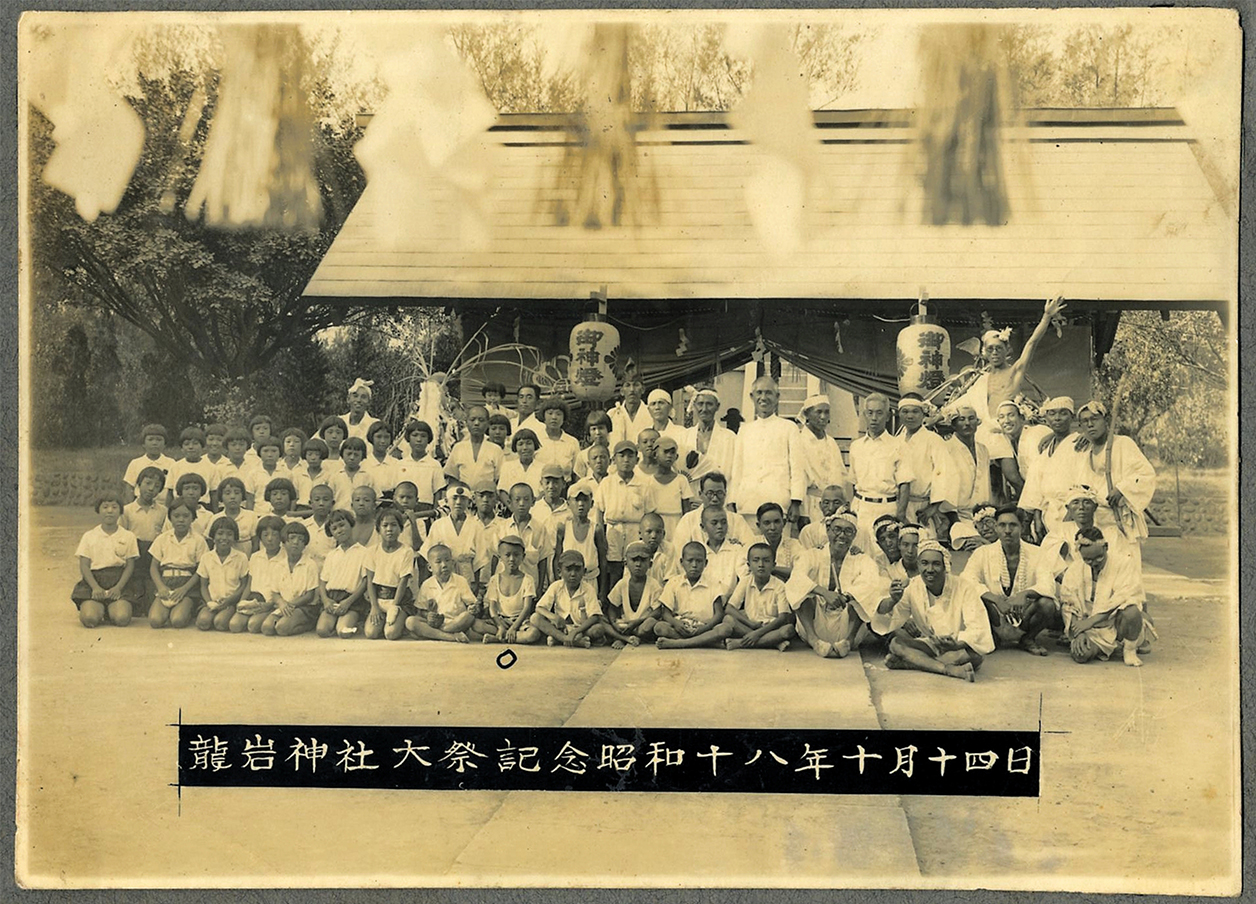 本照片上註明「龍岩神社大祭記念昭和十八年十月十四日」,按該年為西元1943年。畫面中推測應該是公學校(小學)老師帶領學生前往龍岩神社參與祭典所拍攝。大人們有身穿西裝者,亦有神社人員打扮者。學生們則統一穿著制服,但也有上身穿著內衣者。全體在懸掛御神燈的神社前合影留念。