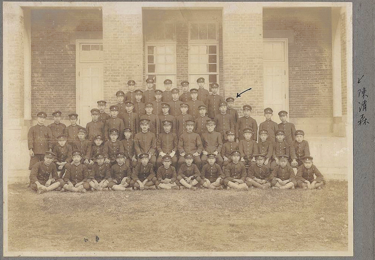 本照片為學校師生合影留念。其中註明陳清森。照片年代可能是進入第二次世界大戰期,戰爭期男子中等學校在膝蓋以下打綁腿。學生穿著洋式立領男生制服,制帽上飾有該校徽章。形式類似官服或陸軍服,冬季黑色制服,灰白色綁腿與黑色皮鞋。身後紅磚造建築為日治時期仿英國維多利亞風格磚造風格,並以圓柱為主,並雜以木製門窗。第一排為學生皆盤坐於地,第二排教師、學生皆為坐姿。第三以上學生則全部站立,學生皆頂戴制帽、身穿制服。