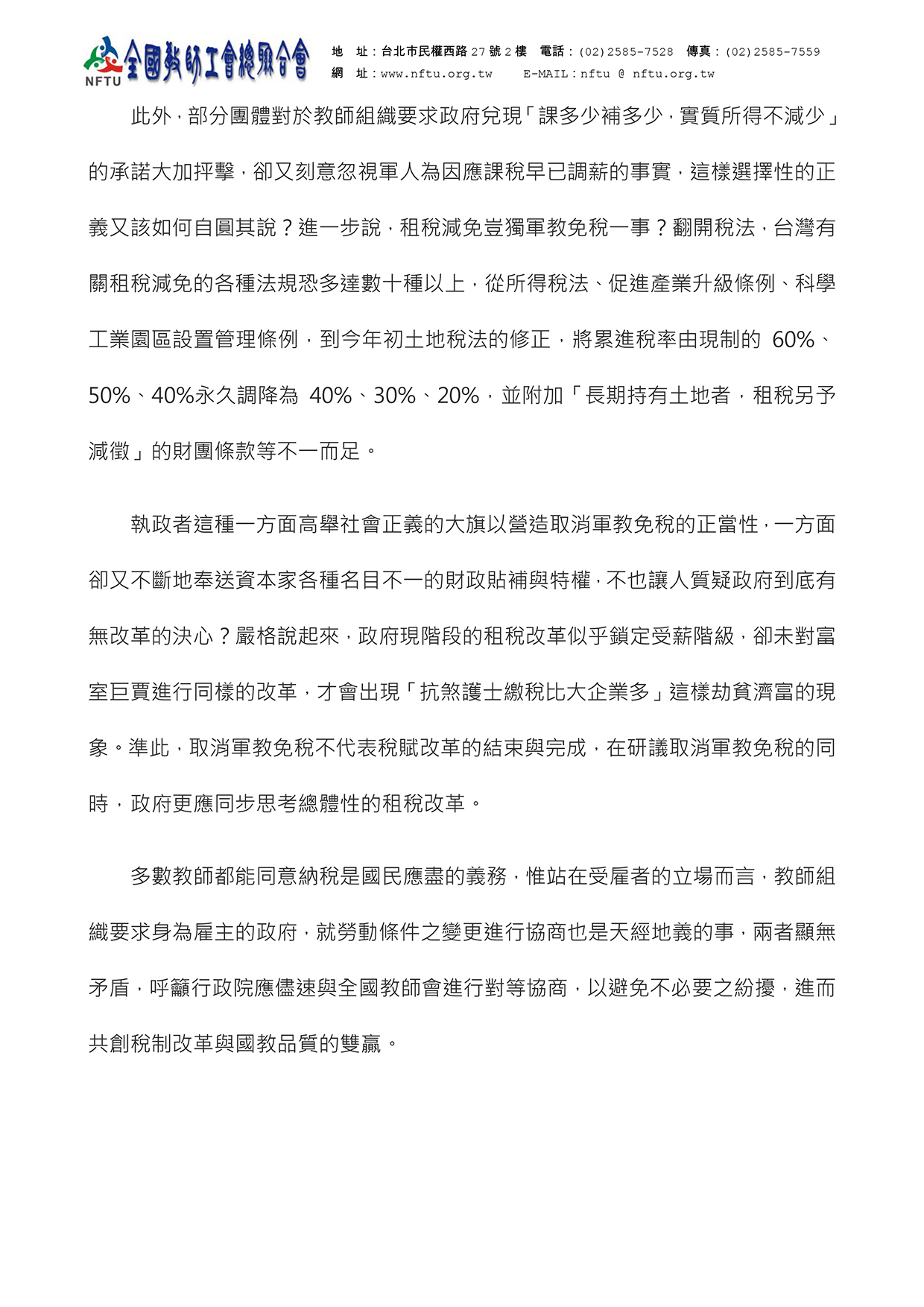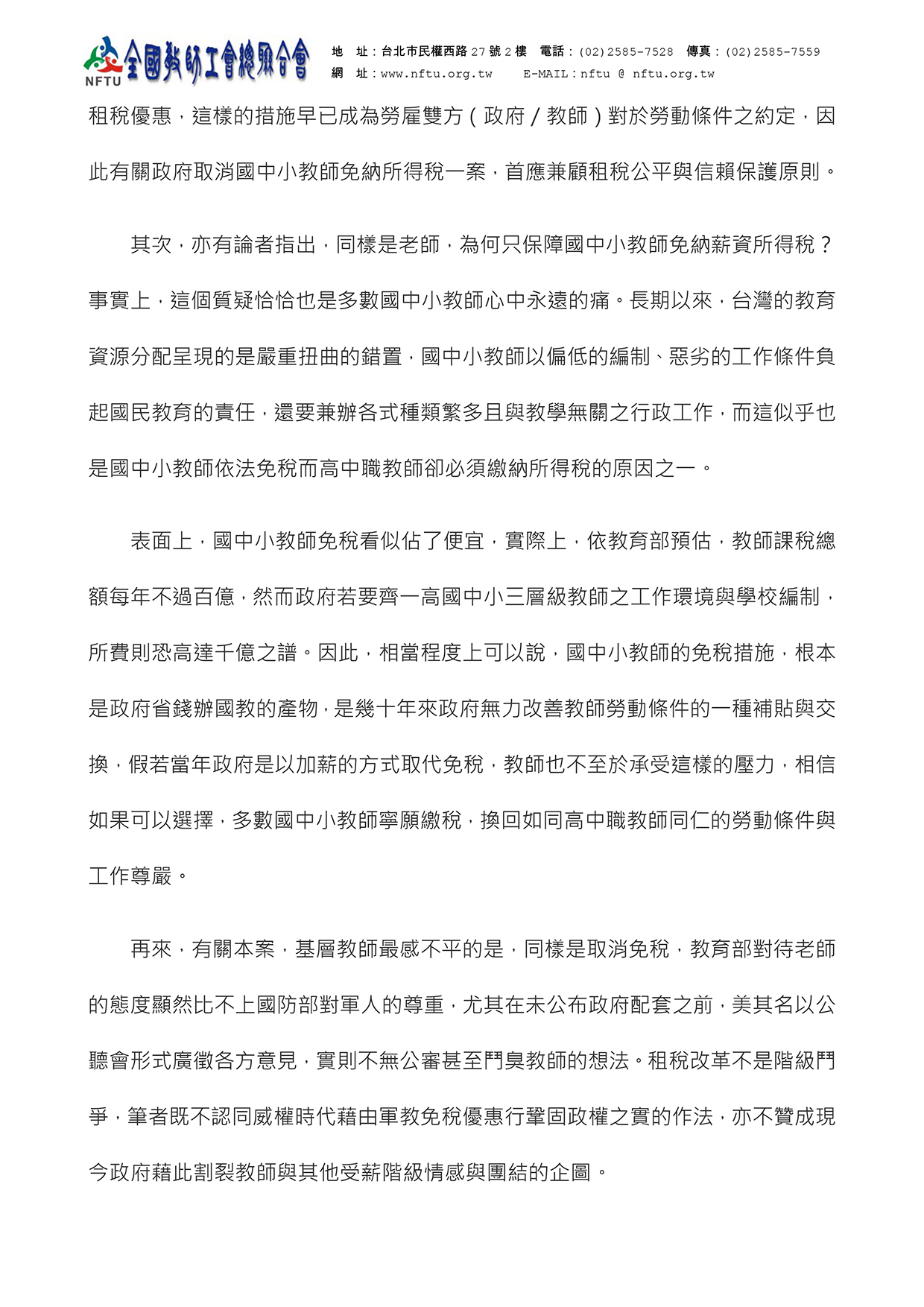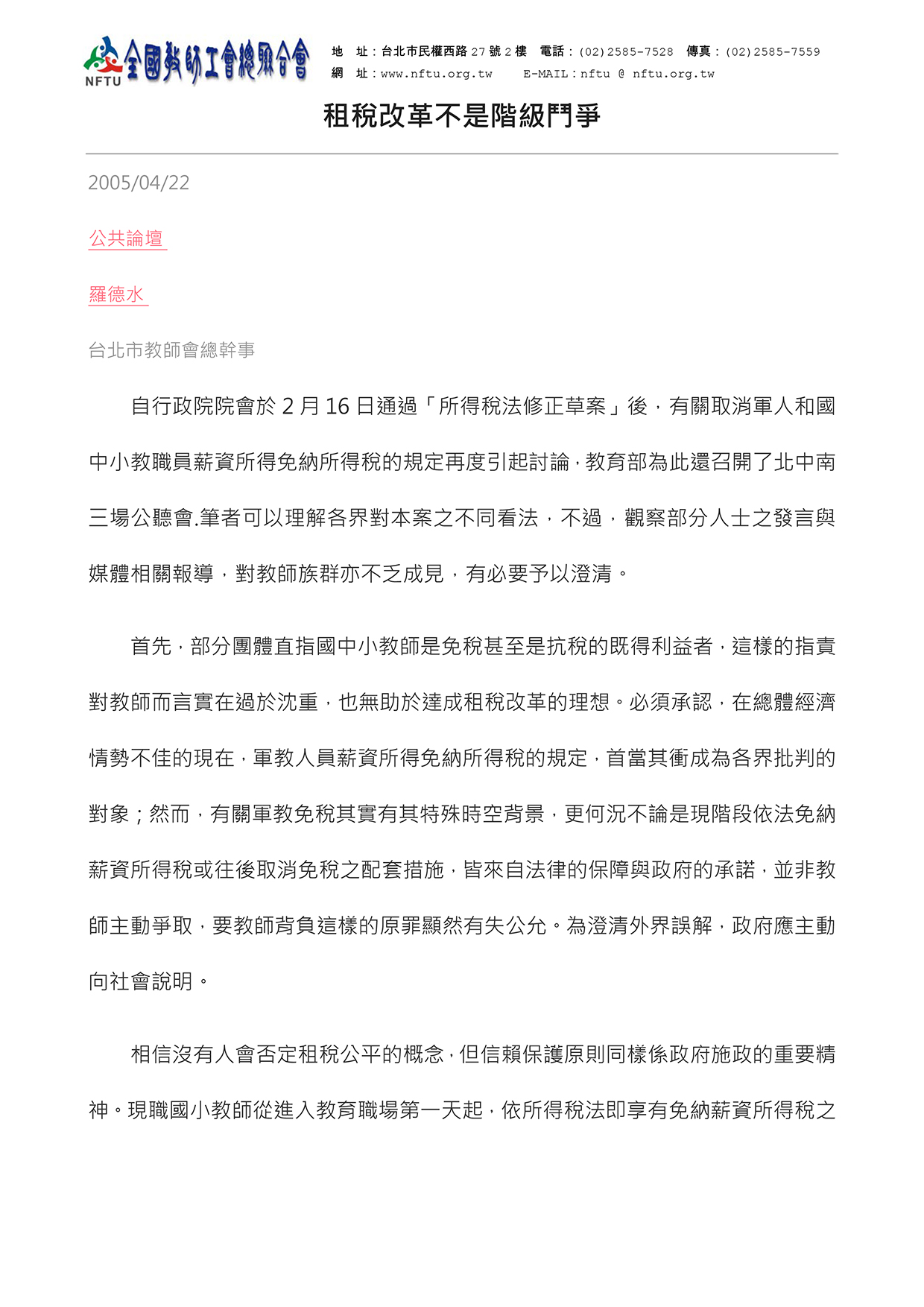 行政院院會於2005年2月16日通過「所得稅法修正草案」,有關取消軍人和國中小教職員薪資所得免納所得稅的規定再度引起討論,教育部為此還召開了北中南三場公聽會。有鑑於部分人士之發言與媒體相關報導,對教師族群顯有成見,例如指責「國中小教師是免稅甚至是抗稅的既得利益者」;質疑「同樣是老師,為何只保障國中小教師免納薪資所得稅」;抨擊「教師組織要求政府兌現『課多少補多少,實質所得不減少』的承諾」等,台北市教師會總幹事羅德水為此文一一加以說明、澄清,且針對政府擬取消國中小教師免納所得稅一案,主張應兼顧租稅公平與信賴保護原則,在研議取消軍教免稅的同時,政府更應同步思考總體性的租稅改革,並呼籲行政院應儘速與全國教師會進行對等協商。