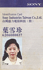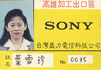 本物件為葉雪珍於SONY台灣盛力電信科技公司工作期間使用之員工證、識別證及會計用章。葉雪珍在高職商科畢業前,就因為有參加會計事務所為日商公司招考會計專員的考試,因此畢業後順利進入日商SONY的子公司─台灣盛力電信科技公司。