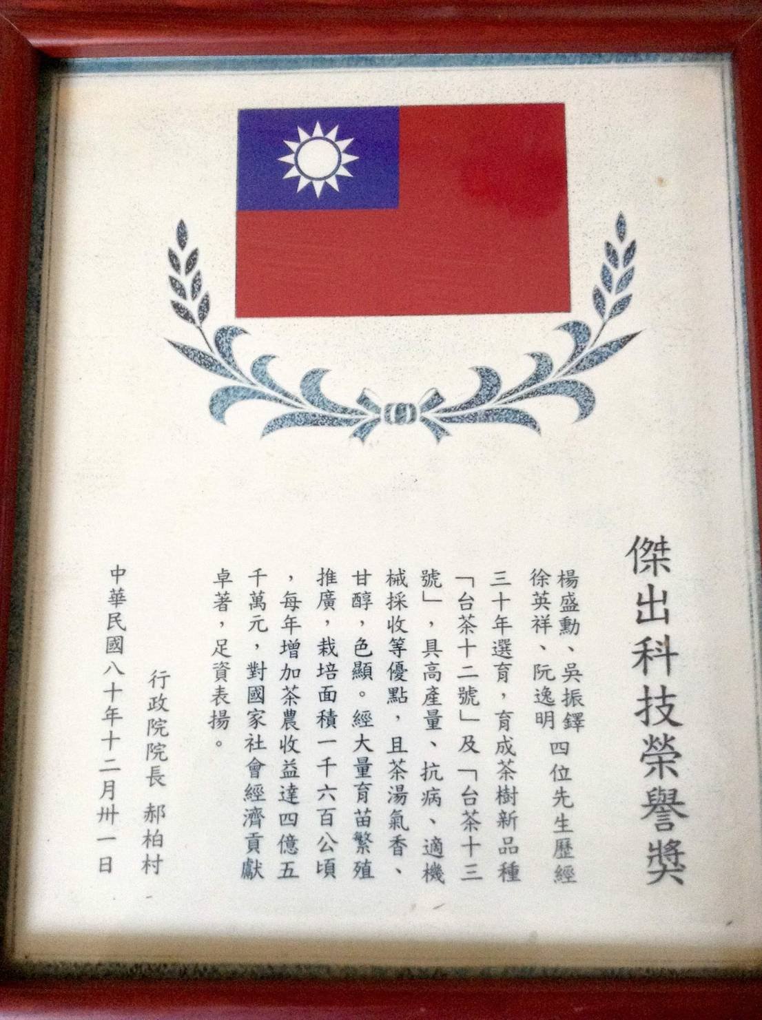 圖為茶葉改良場育成臺茶12號(金萱)及臺茶13號(翠玉),獲頒「行政院傑出科技榮譽獎」之獎狀。