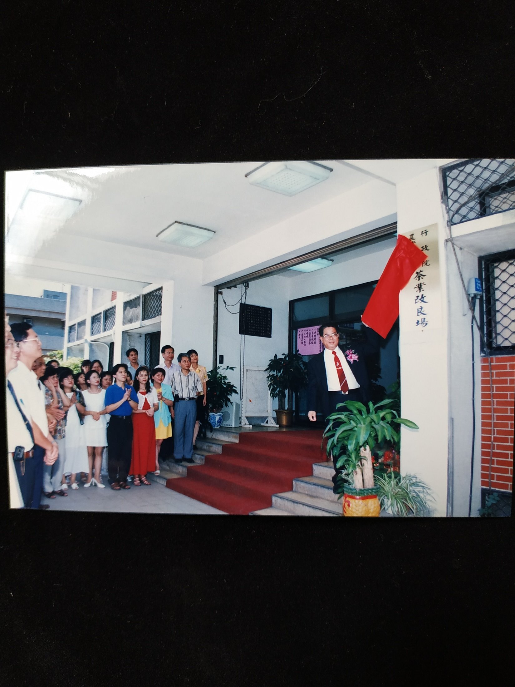 圖為1999(民國88)年7月1日茶業改良場改隸行政院農業委員會時之改隸揭牌儀式。接牌者為當時的場長廖慶樑場長。