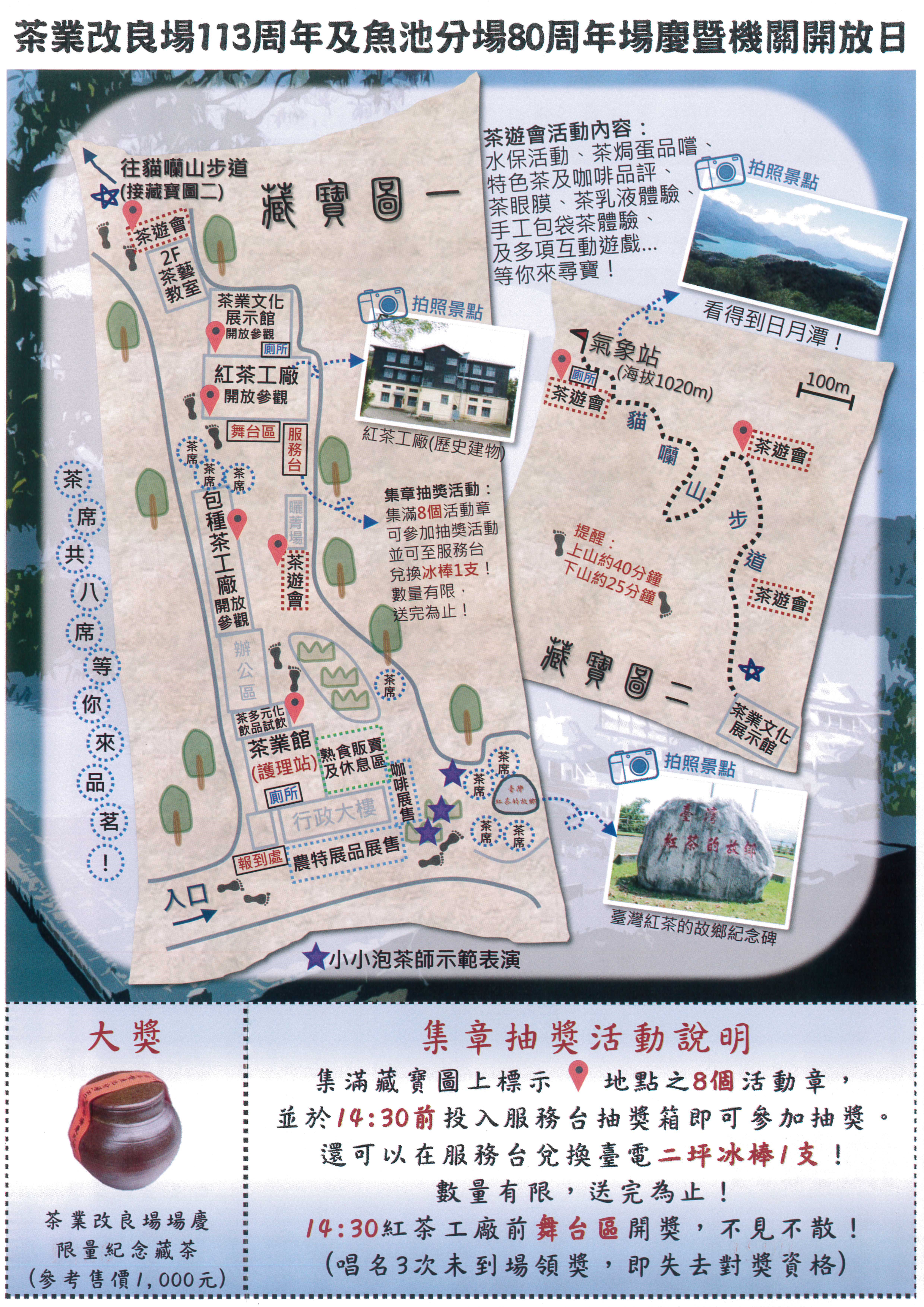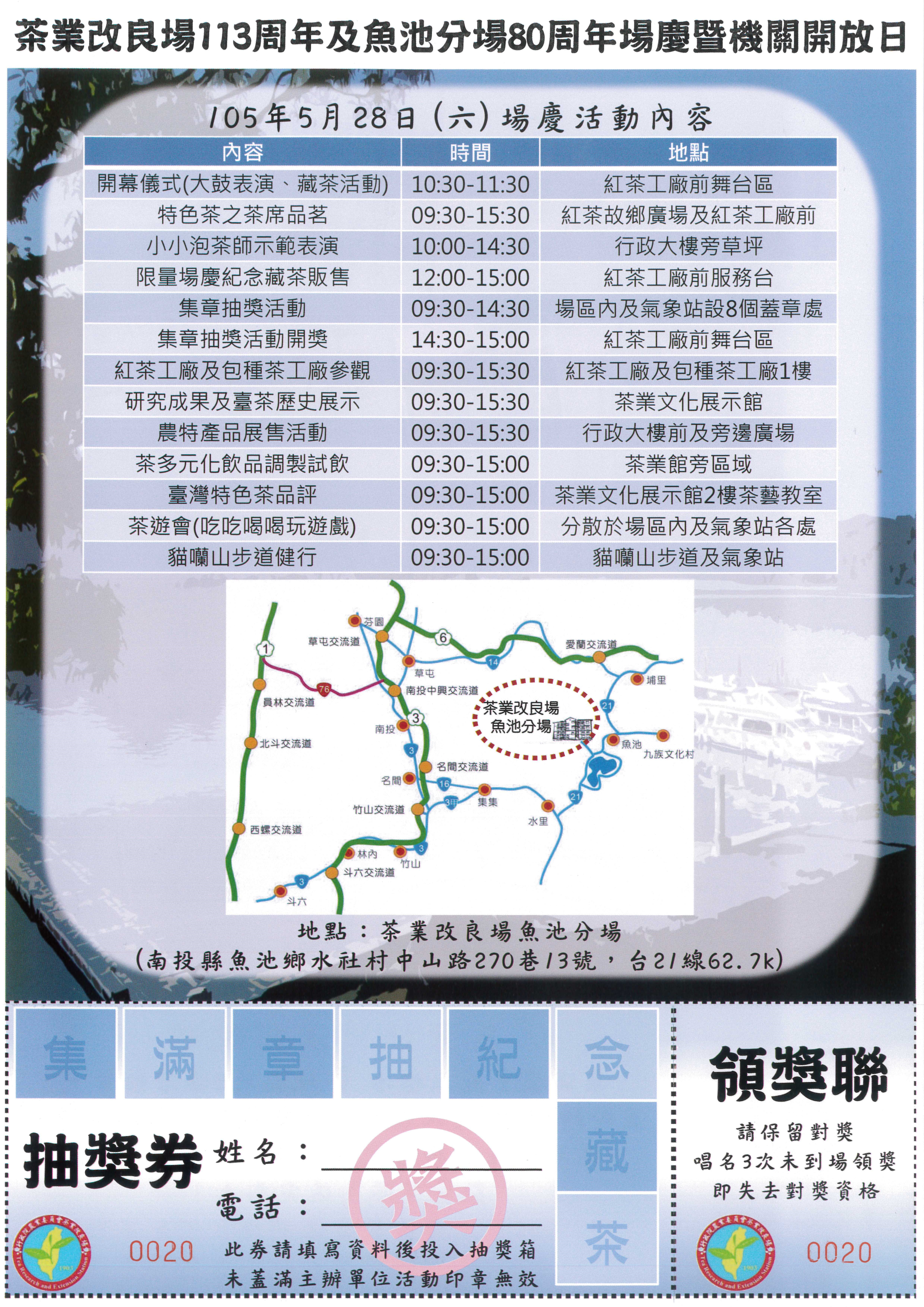圖為2016年(民國105年)茶業改良場113周年及魚池分場80周年場慶暨機關開放日,於茶業改良場於魚池分場舉辦之電子宣傳單。