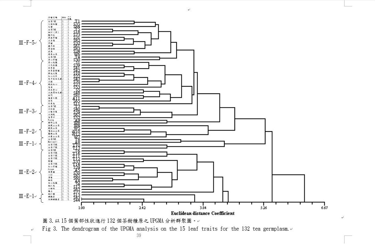 以質與量的15個葉性狀部利用UPGMA法繪製的群聚分析圖,主要依據葉形及葉尖形態將茶樹種原分成三大群。