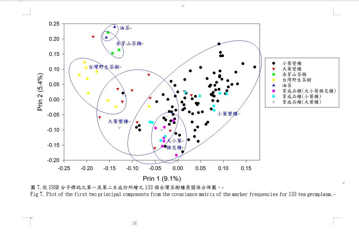 在主成分向量分析方面,顯現的結果與利用群聚分析得到的親緣關係樹狀圖結果相符合。此外,ISSR分析說明台灣茶樹種原間仍存在相當大的遺傳歧異度(58%),但總遺傳歧異度雖大,高比例的遺傳歧異度是由台灣的野生茶樹所貢獻,重要品種間的相似性極高。針對台灣栽培面積較大的22個茶樹種原及3個新品種的ISSR DNA指紋資料可由3個引子(818、864及866)中的10個分子標誌得到有效鑑別。