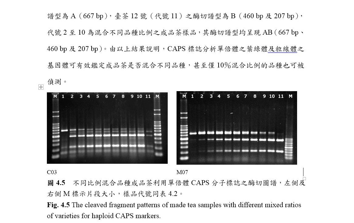 照片是不同比例的混合品種成品茶利用單倍體CAP分子標誌酶切圖譜。可以由圖譜確定出成品茶是否有混用其他品種。即使是10%的混合品種,也可偵測出來。