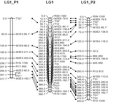 在篩選得到574個SSR、CAPS、AFLP、ISSR及RAPD等多型性分子標誌中, 69個為高度偏差分離之多型性分子標誌(P < 0.001)(12.0%)未加入後續分析。而在參與建構圖譜的505個分子標誌,包含265個來自雄親(52.5%)、163個來自雌親(32.3%)、65個來自雙親的異接合顯性標誌(12.9%),及12個共顯性標誌(2.4%),其中共顯性標誌及來自雙親的異接合顯性標誌扮演連接雄親與雌親圖譜的橋樑基因座。