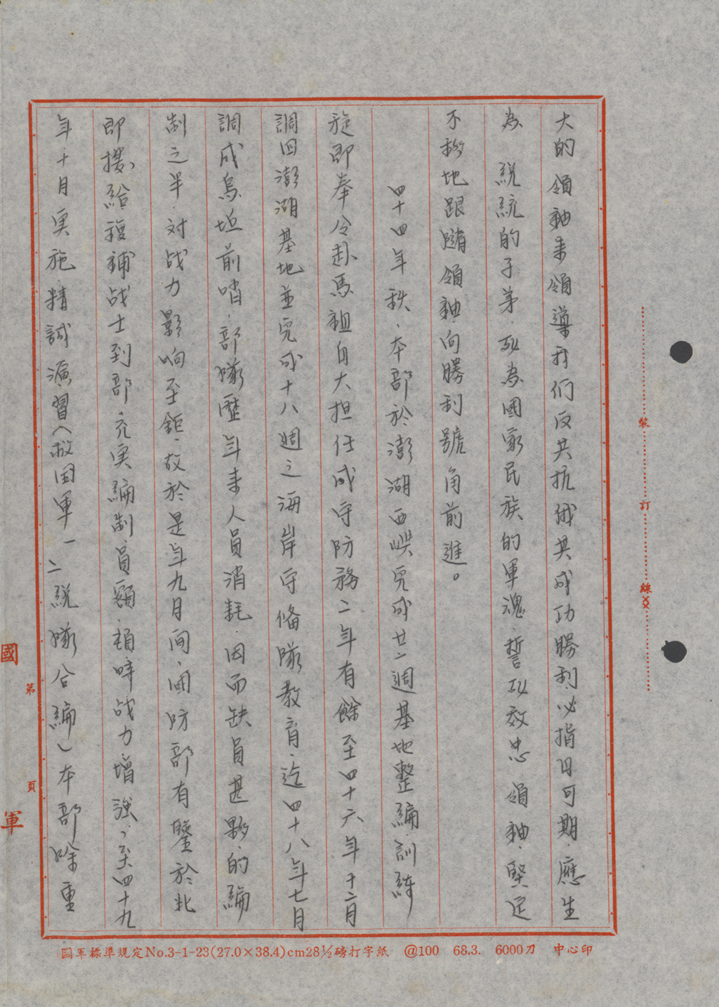民國44年(1955),於澎湖西嶼完成21周基地訓練後,奉令赴馬祖白犬成守防務二年,民國46年12月調回澎湖,並完成18周海岸守備隊教育,再於民國48年7月調戍烏坵前哨。因部隊歷年來人員消耗,對戰力影響甚鉅,國防部有鑒於此,於民國48年9月間,撥給回役戰士到部隊,充實編制員額,以增強戰力。