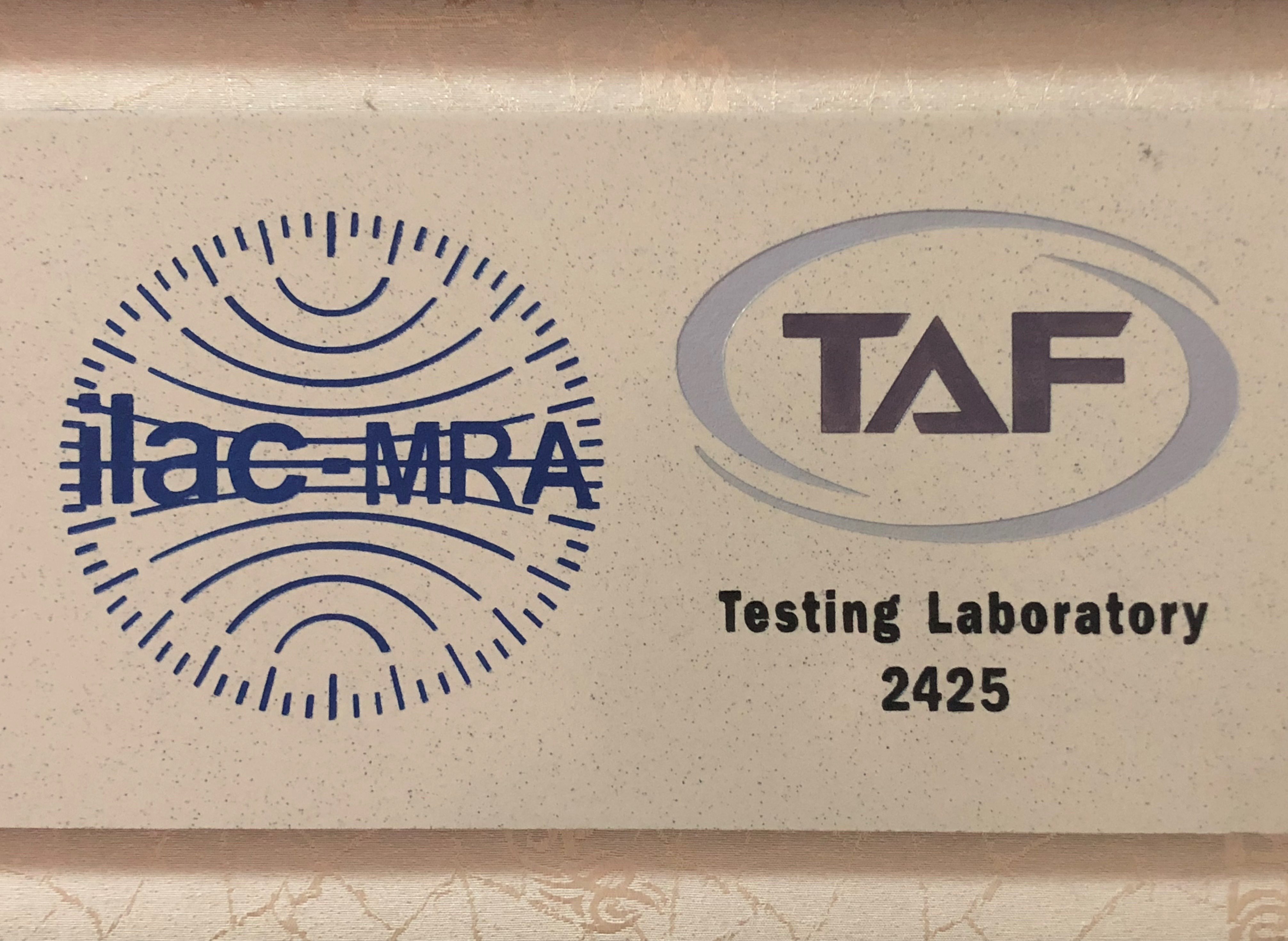 圖為茶業改良場農業藥物檢驗中心通過「財團法人全國認證基金會」 (Taiwan Accreditation Foundation;TAF)認證,所獲得之國際實驗室認證聯盟相互承認之測試實驗室之匾額及證號。