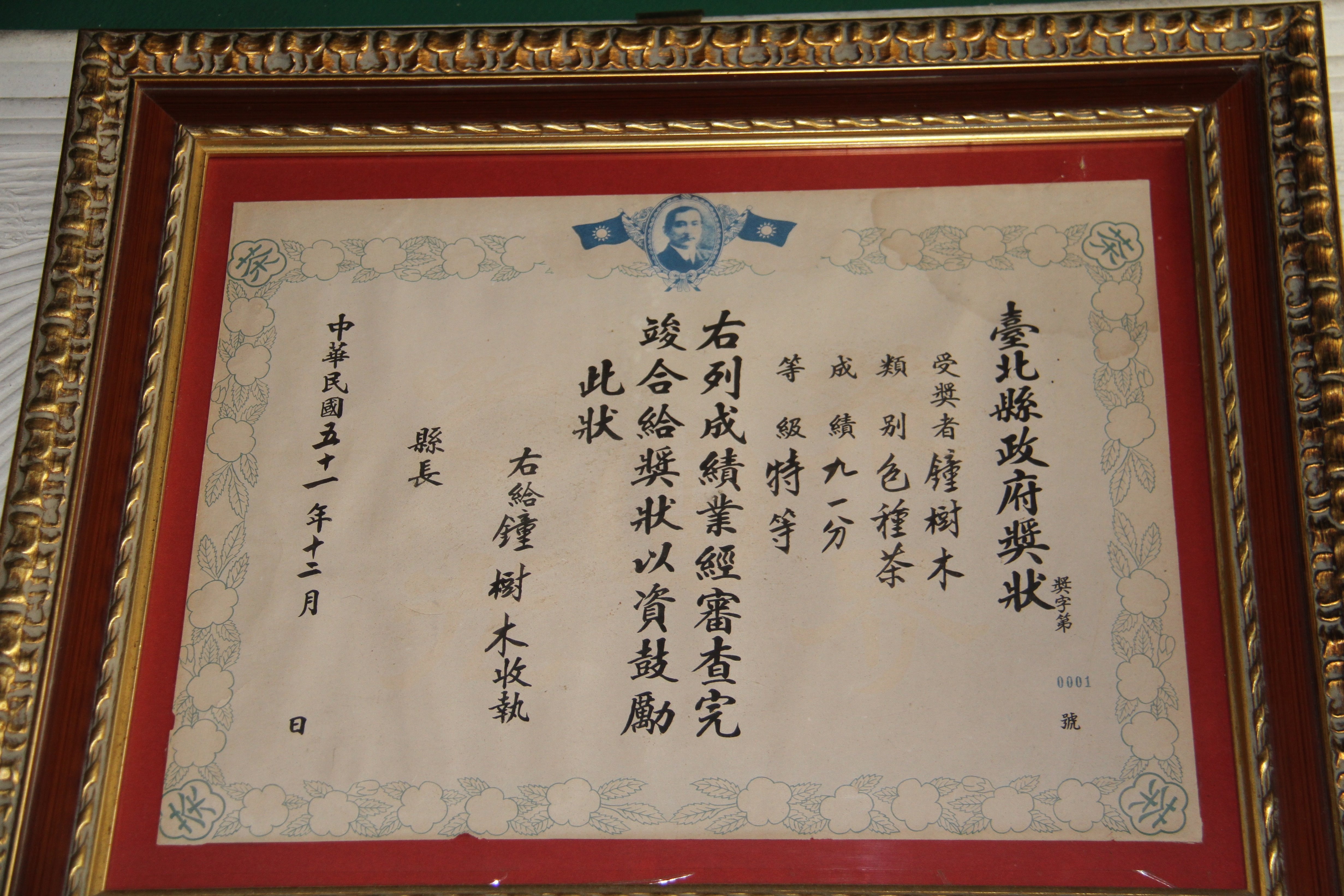 圖中的獎狀係鐘樹木先生在1962年(民國51年)第三屆台北縣坪林鄉文山包種茶比賽中拿到特等獎之獎狀。
