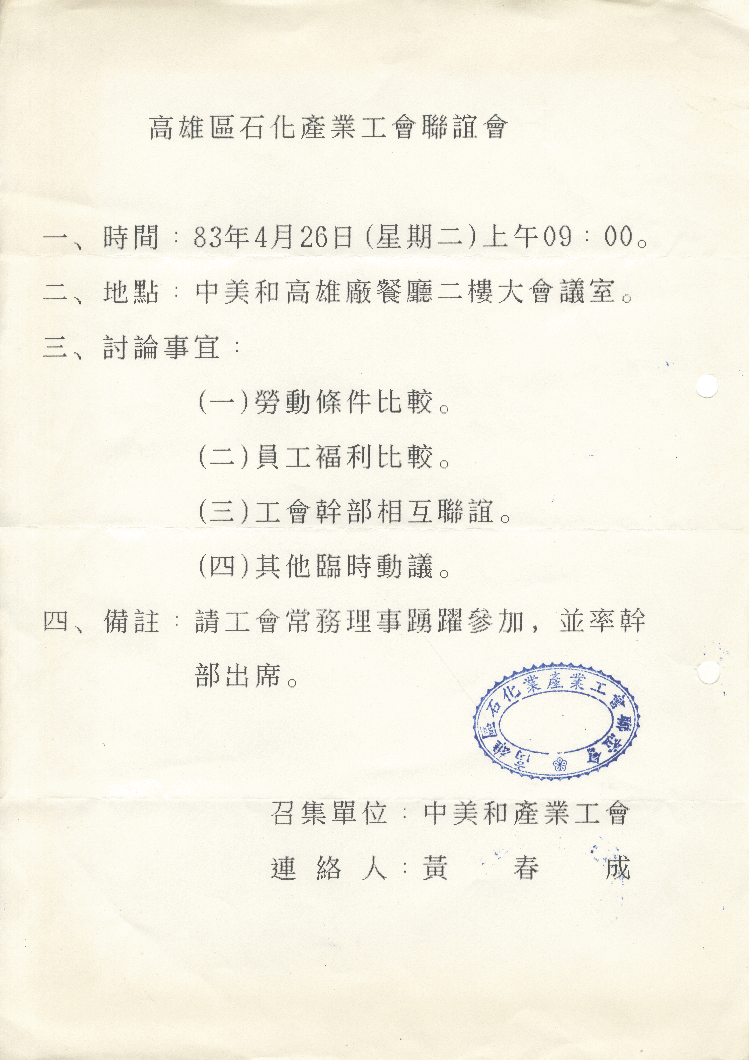 由於當時的工會法限制,「高雄區石化產業工會聯誼會」並非法定的工會聯合組織,所以由各工會輪流召集聚會,文件中的會議由中美和產業工會召集。