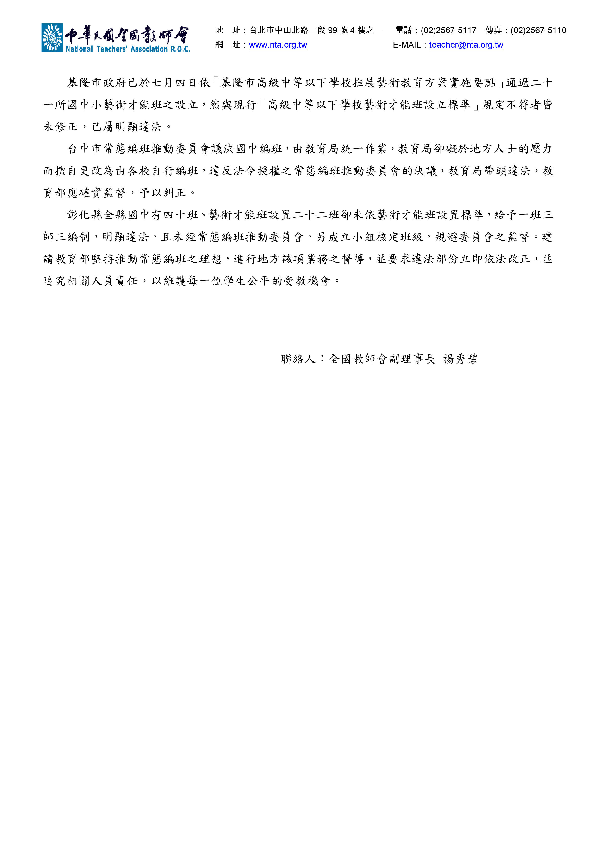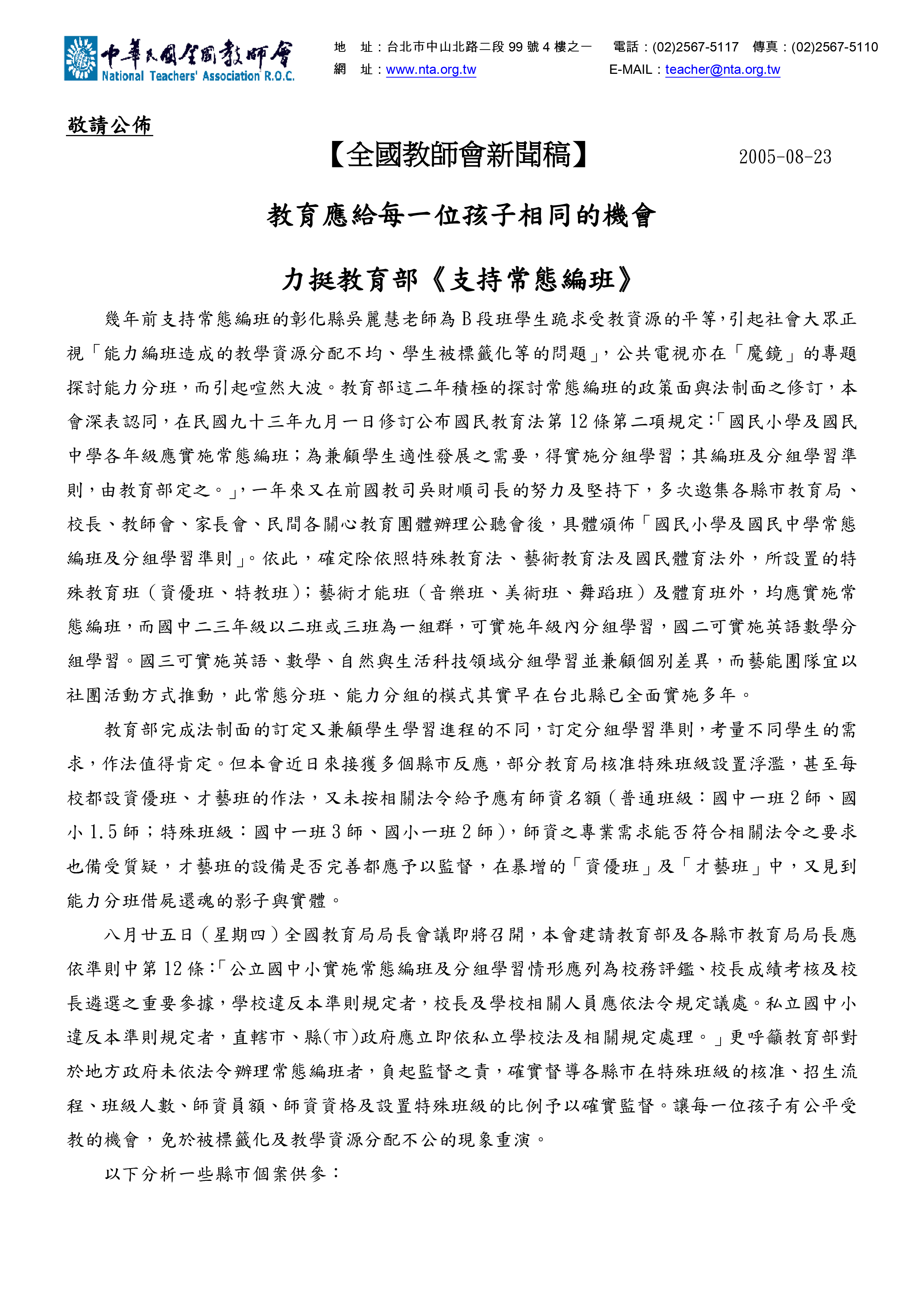 20050823【新聞稿】教育應給每一位孩子相同的機會 力挺教育部《支持常態編班》