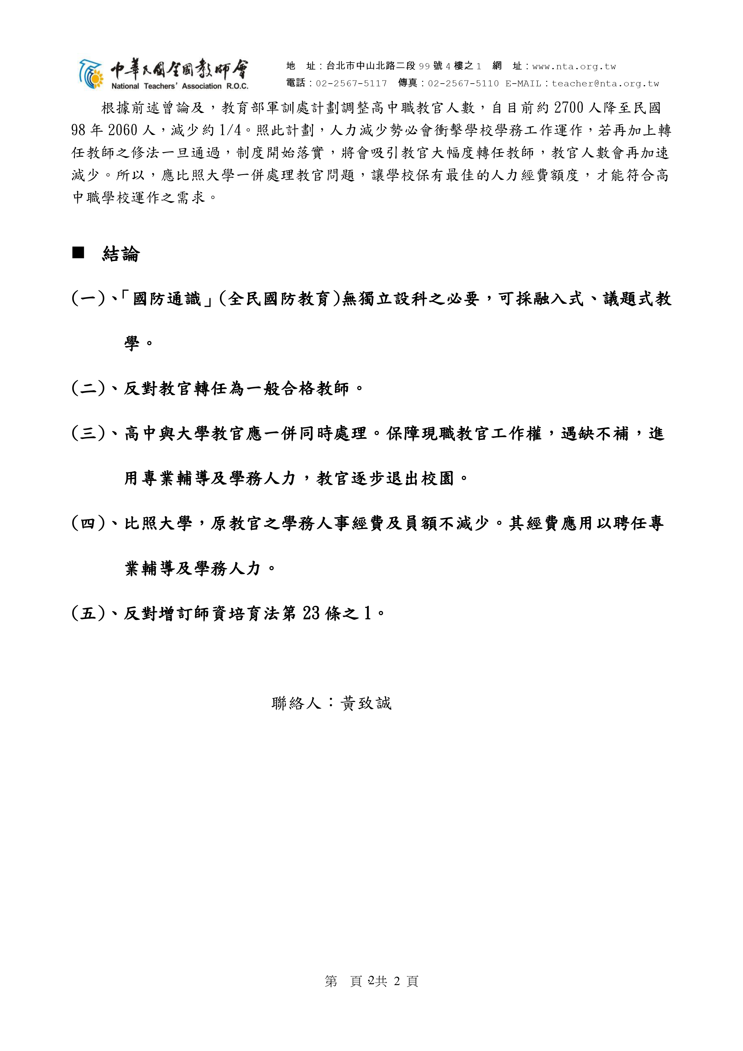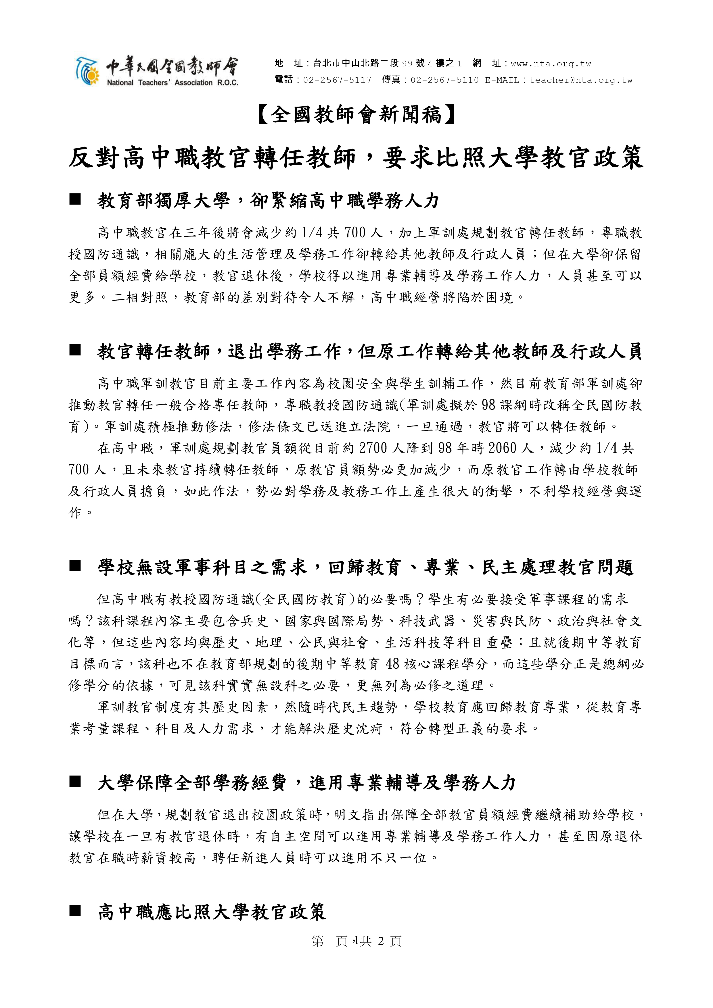 20070110【新聞稿】反對高中職教官轉任教師,要求比照大學教官政策
