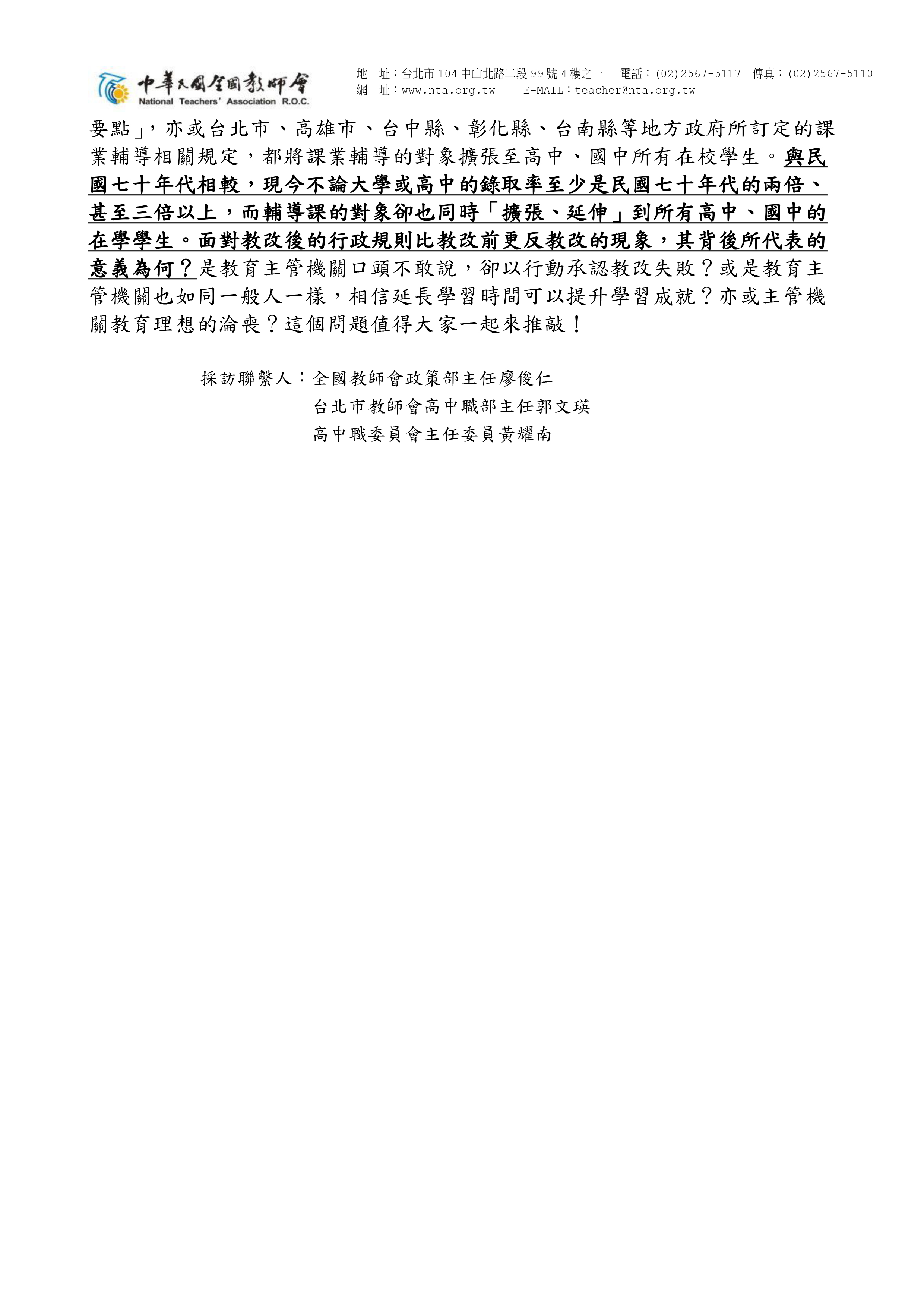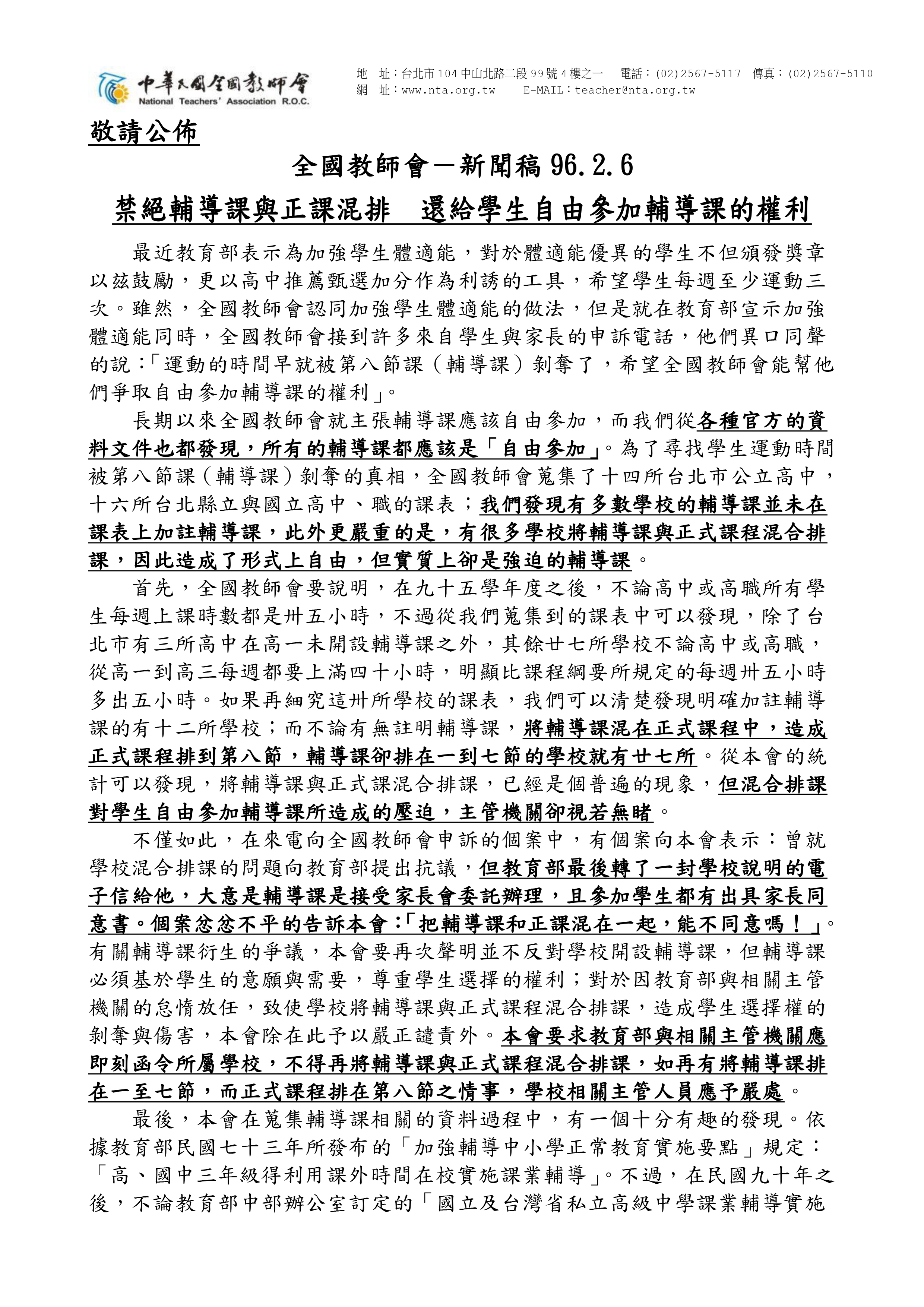 20070206【新聞稿】禁絕輔導課與正課混排--全國教師會960206新聞稿