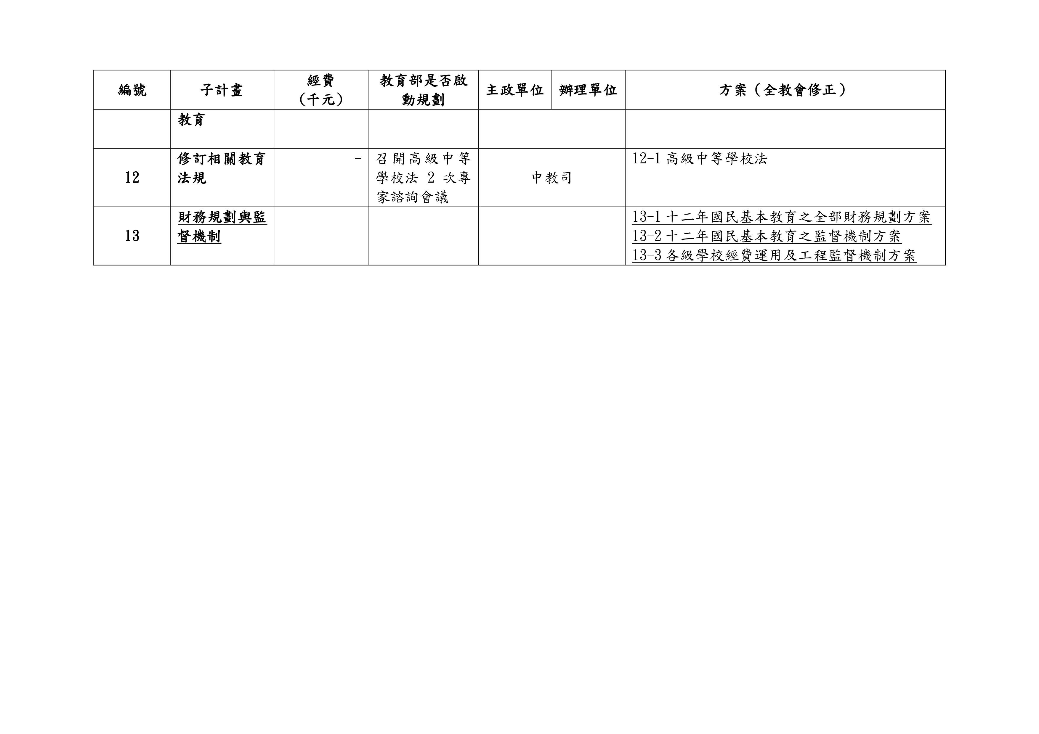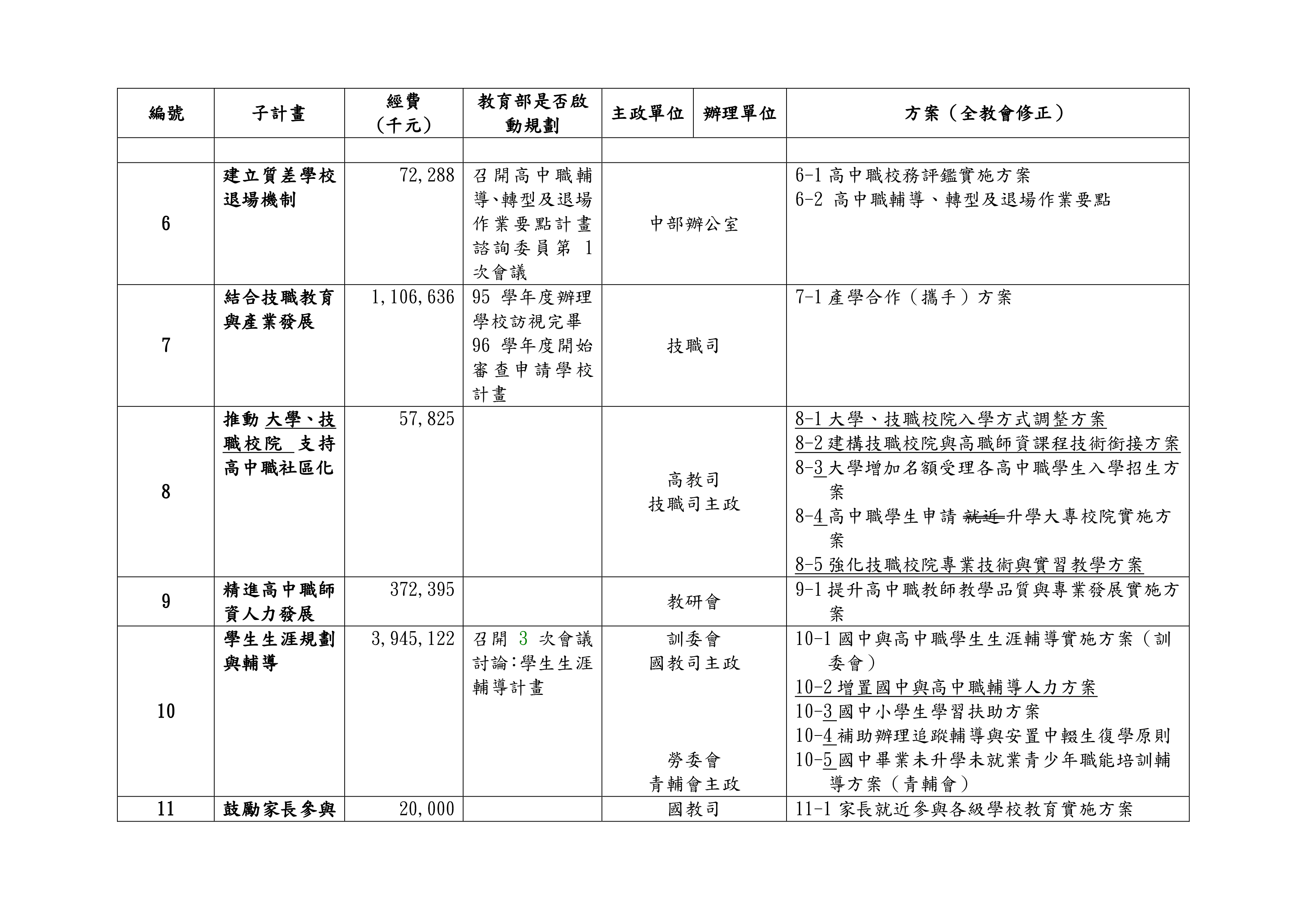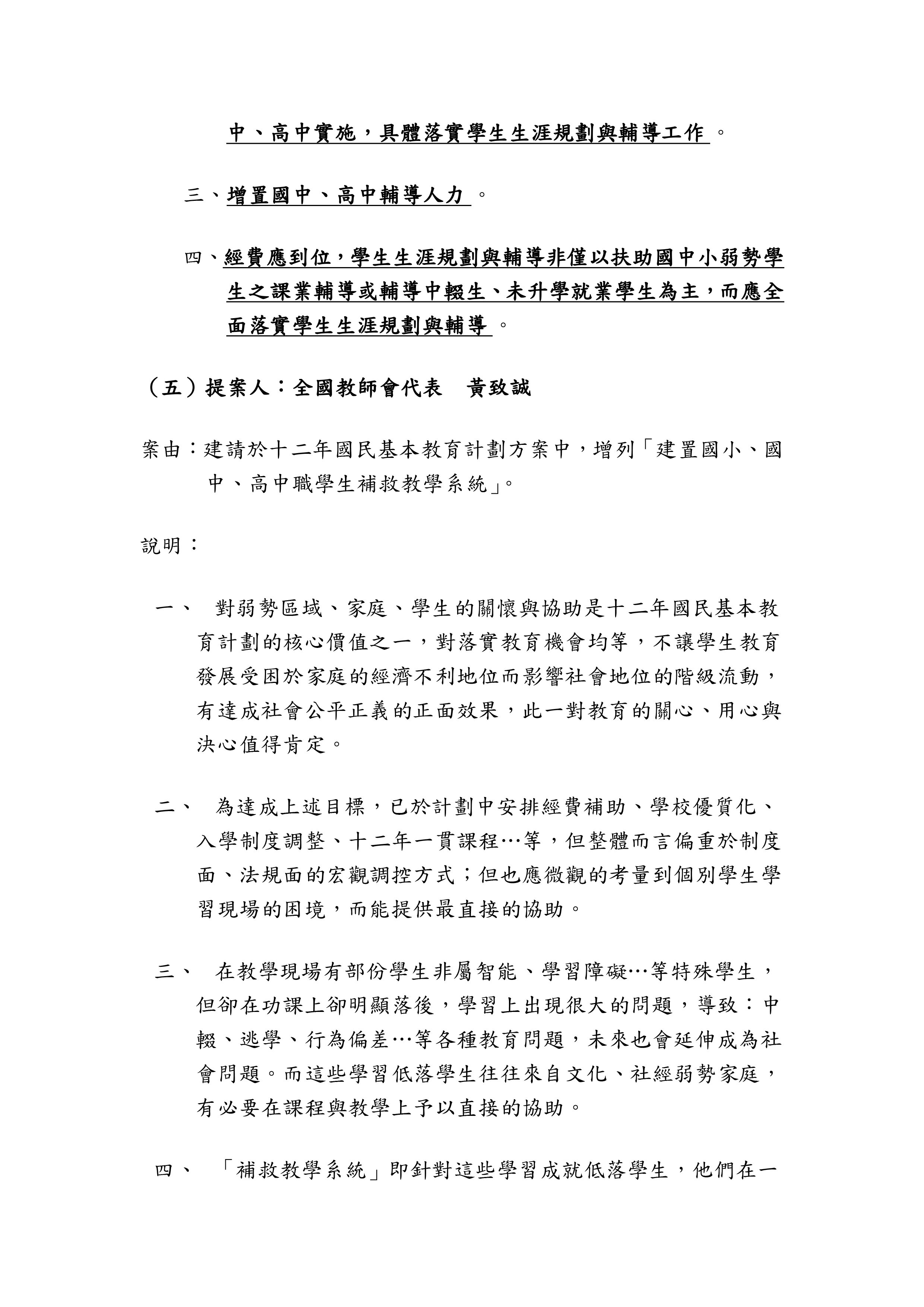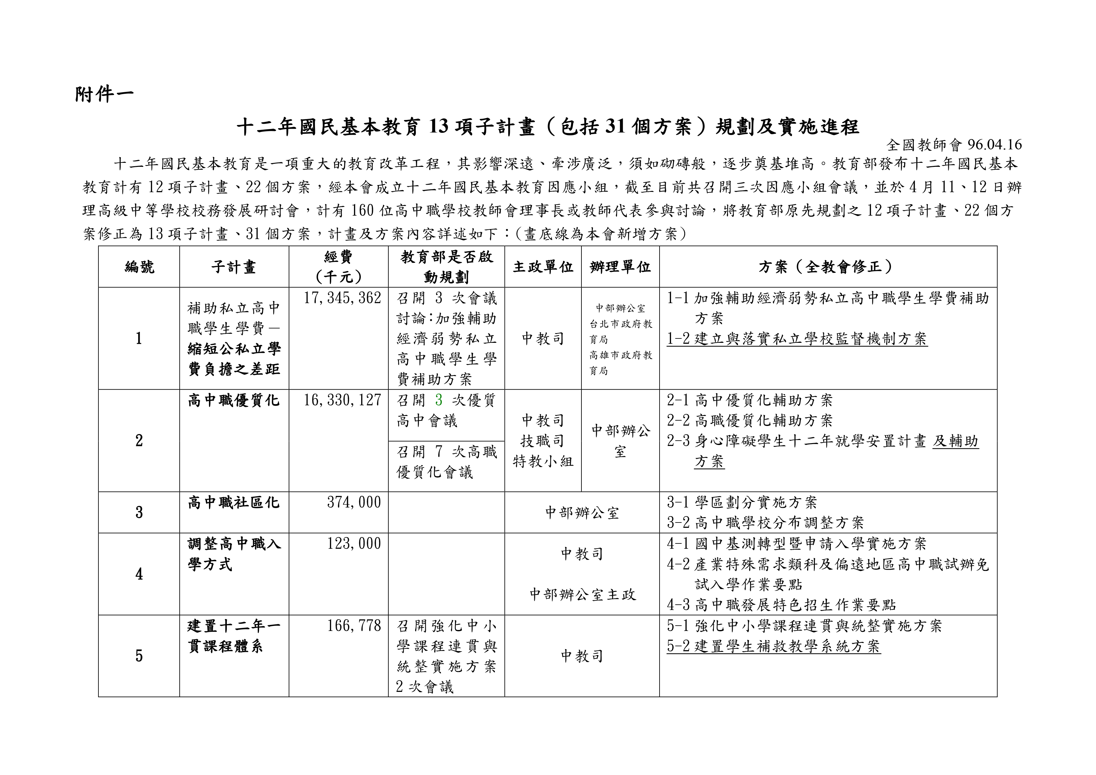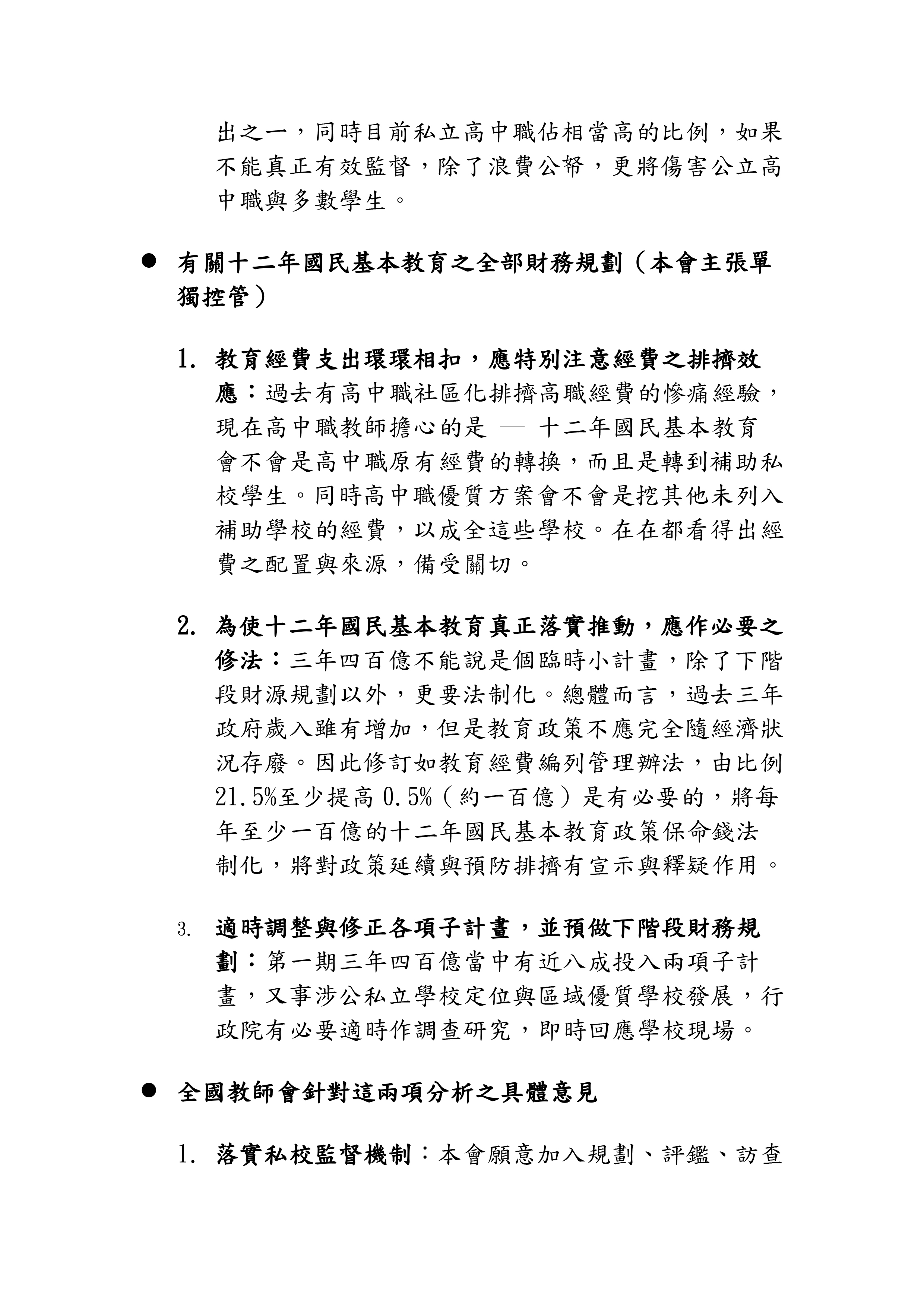 中華民國全國教師會(全教會)於2007年4月17日發佈新聞稿【全國教師會對於十二年國民基本教育議題與院長有約的相關說明】,全教會認為十二年國民基本教育是一項重大的教育改革工程,其影響深遠、牽涉廣泛,須如砌磚般,逐步奠基堆高。因此,全教會將教育部發布十二年國民基本教育計畫,經充分討論後,將教育部原先規劃之12項子計畫、22個方案修正為13項子計畫、31個方案。 全教會認為行政院發布此一政策屬於高中職優質化及補助弱勢的扶助,欣見行政院採納全教會意見,將經費增加至三年四百億,且將規劃期程加長至一年,唯基層教師在國教經費及特教經費尚不足夠的現況下,不免憂心經費排擠或後繼無援,而且實施規劃時程過於緊湊之際,除了十二項子計畫二十二個方案外深覺尚有不足,全教會小組積極擬定相關修正意見及增訂議題增加為十三項子計畫三十一個方案,乃鑑於增加教育經費固然重要,但是擬定合宜的政策、政策的落實以及經費的有效運用更是關鍵。