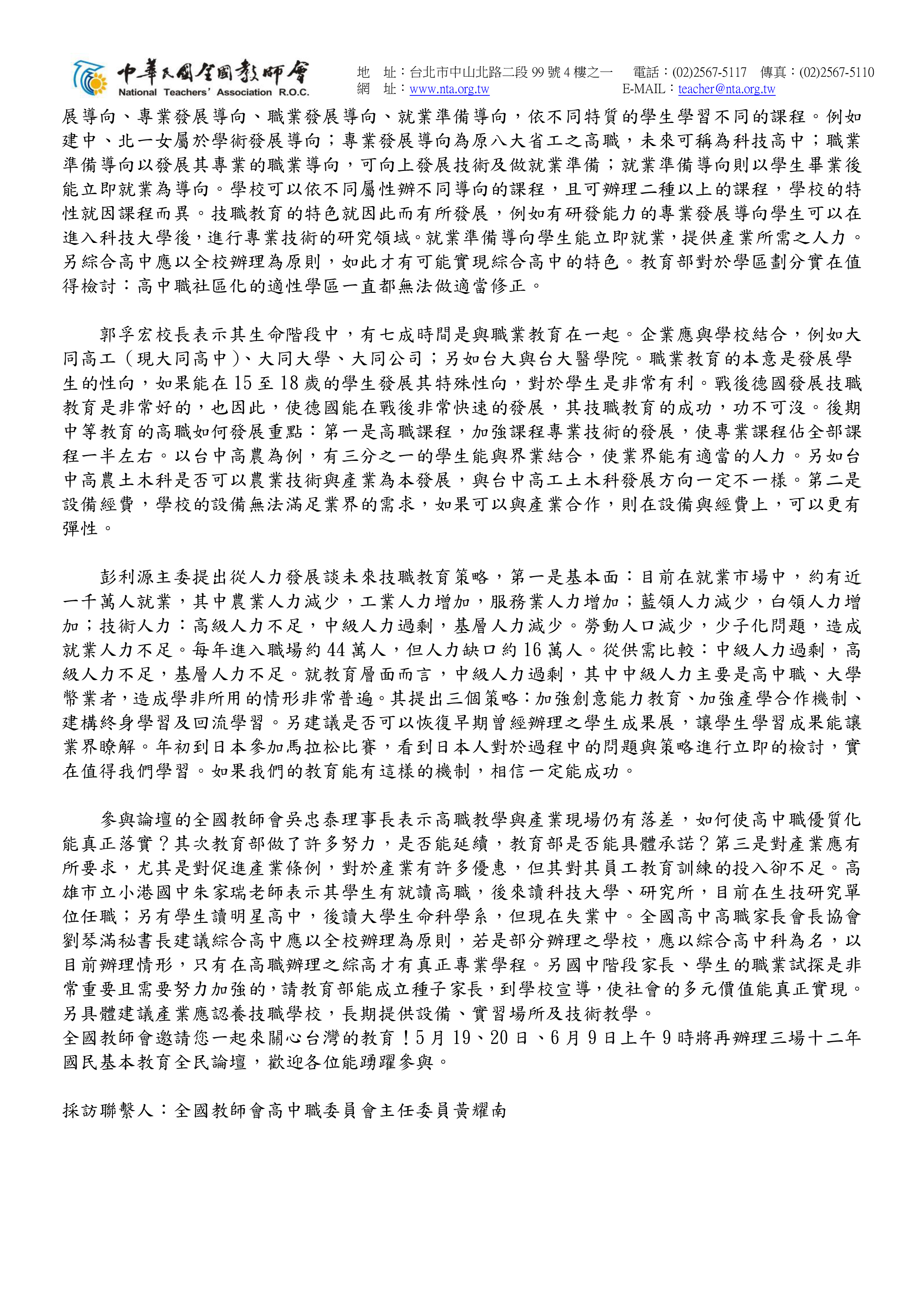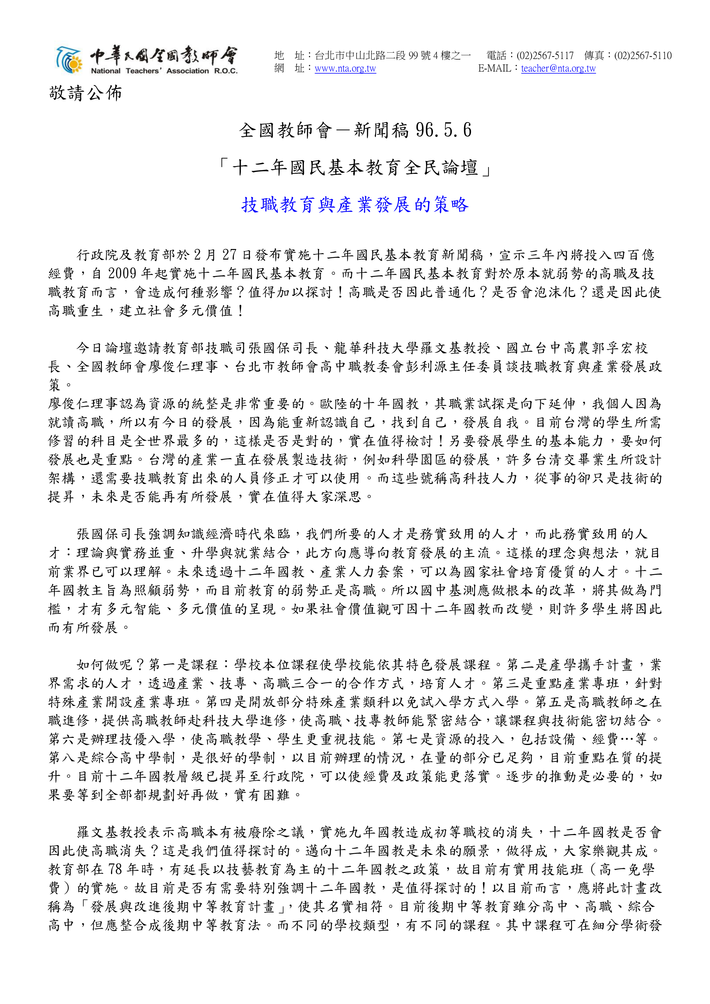 20070506十二年國民基本教育全民論壇-技職教育與產業發展-全國教師會新聞稿