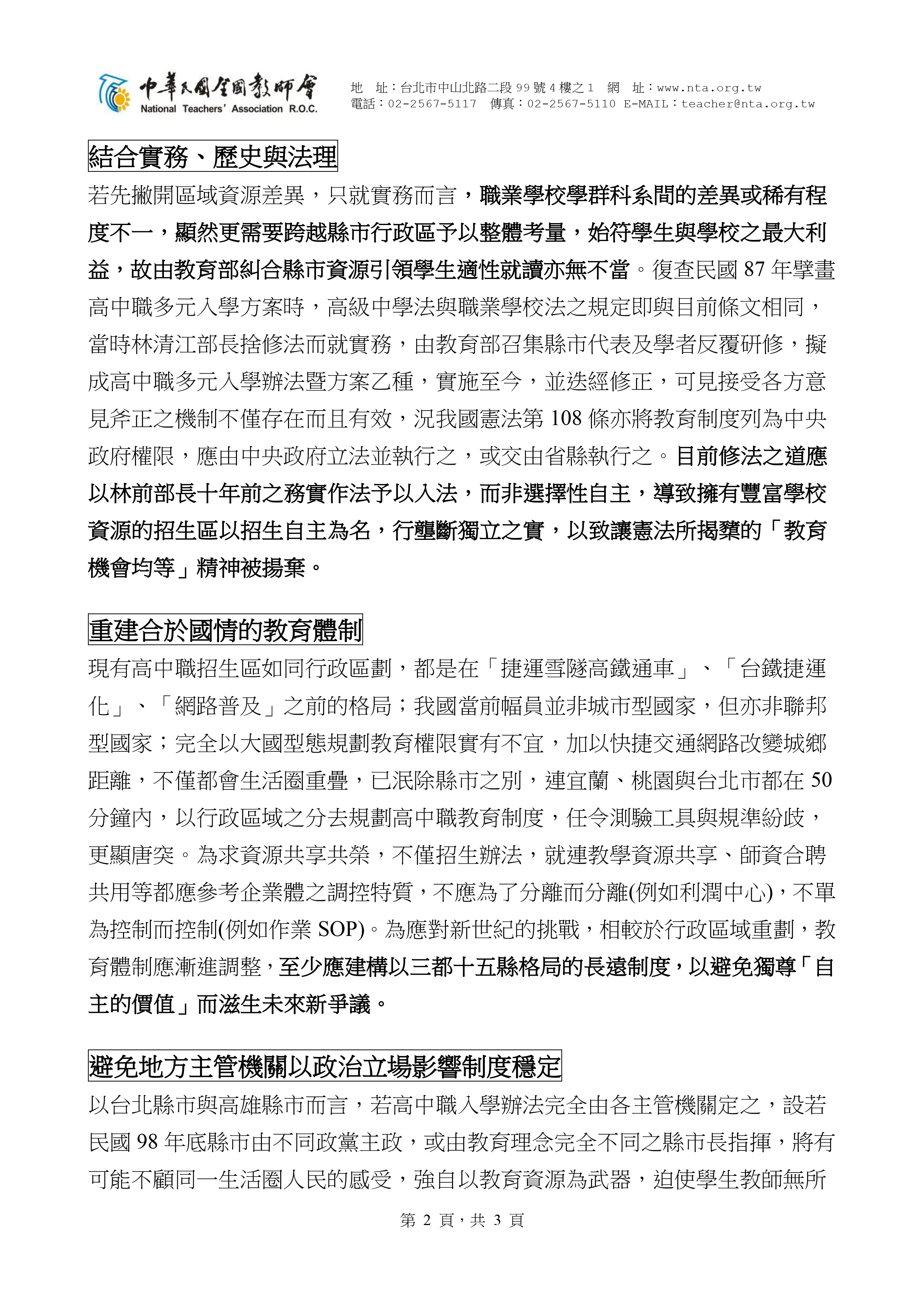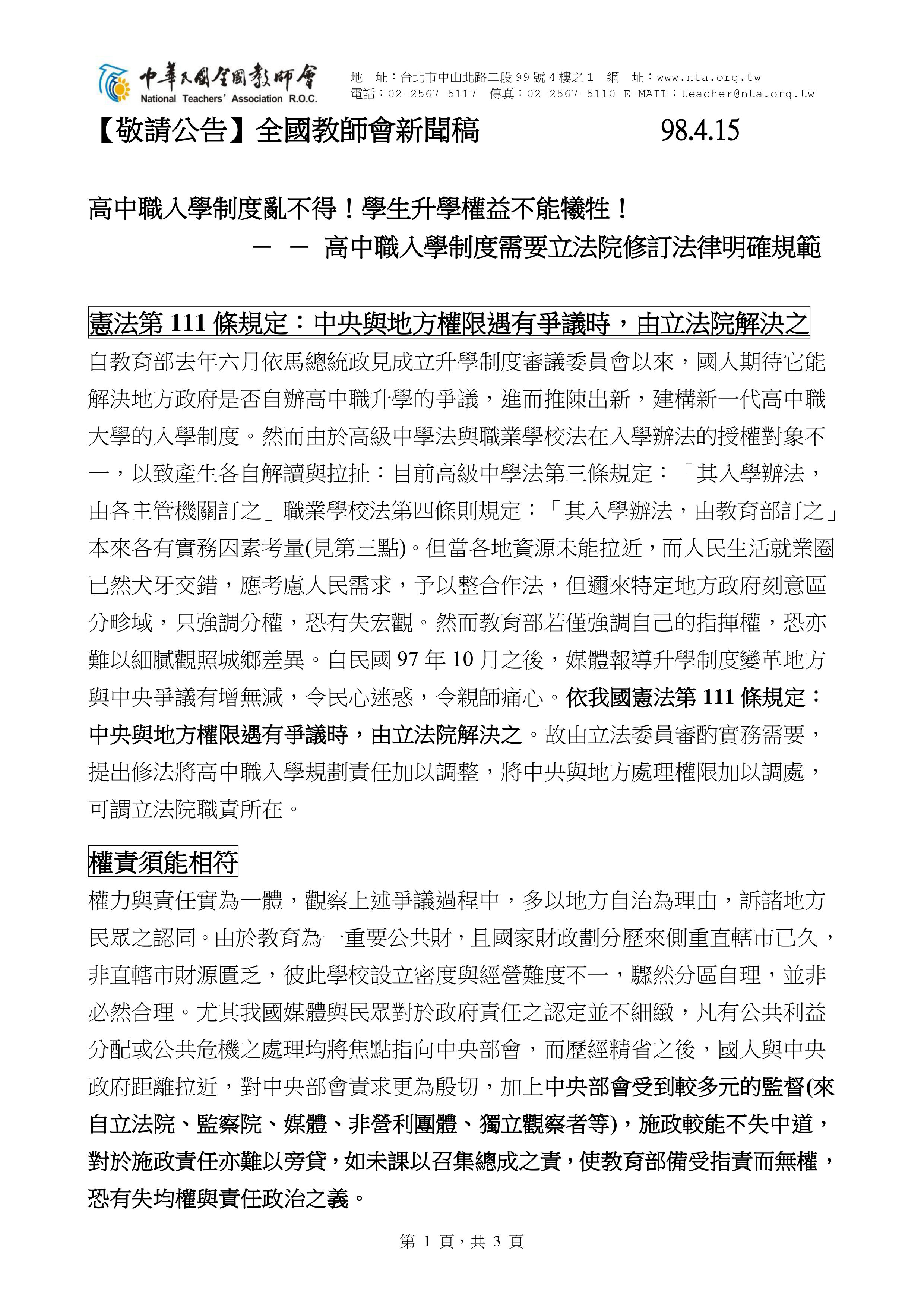 教育部於2008年6月成立升學制度審議委員會,國人原期待它能解決地方政府是否自辦高中職升學的爭議,建構新一代高中職大學的入學制度,但因《高級中學法》規定「其入學辦法,由各主管機關訂之」,與《職業學校法》的規定「其入學辦法,由教育部訂之」不同,以致產生中央與地方政府各自解讀與拉扯。為此,中華民國全國教師會(簡稱全教會)發出本新聞稿,從「憲法第111條規定」、「權責須能相符」、「結合實務、歷史與法理」、「重建合於國情的教育體制」、「避免地方主管機關以政治立場影響制度穩定」,以及「教育改革的再秩序化」等六項理由,呼籲立法院應同步修正《高級中學法》與《職業學校法》,將入學相關辦法統一改為「由教育部召集各級教育主管機關共同訂定之」。