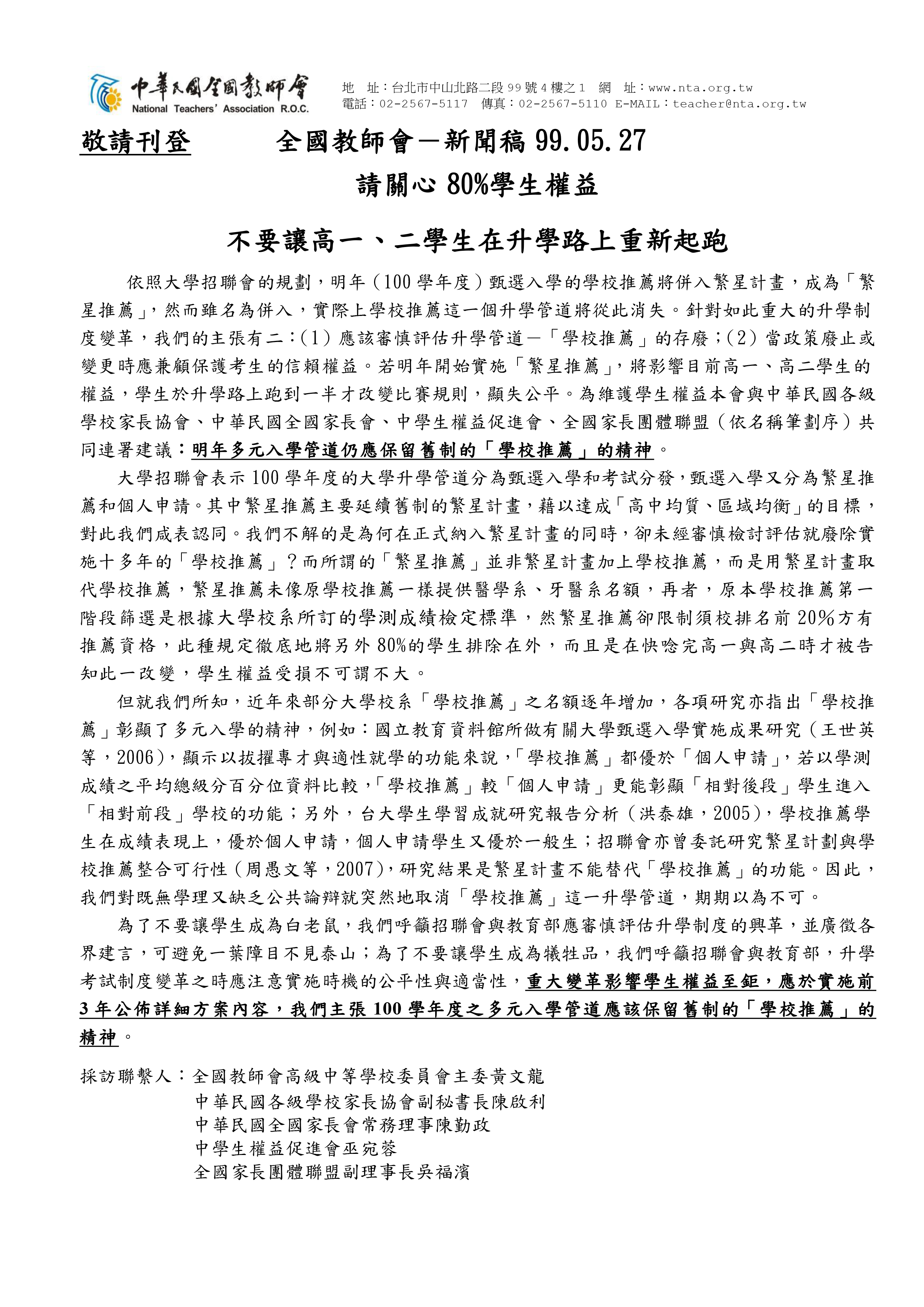 20100527【新聞稿】請關心80%學生權益 不要讓高一、二學生在升學路上重新起跑
