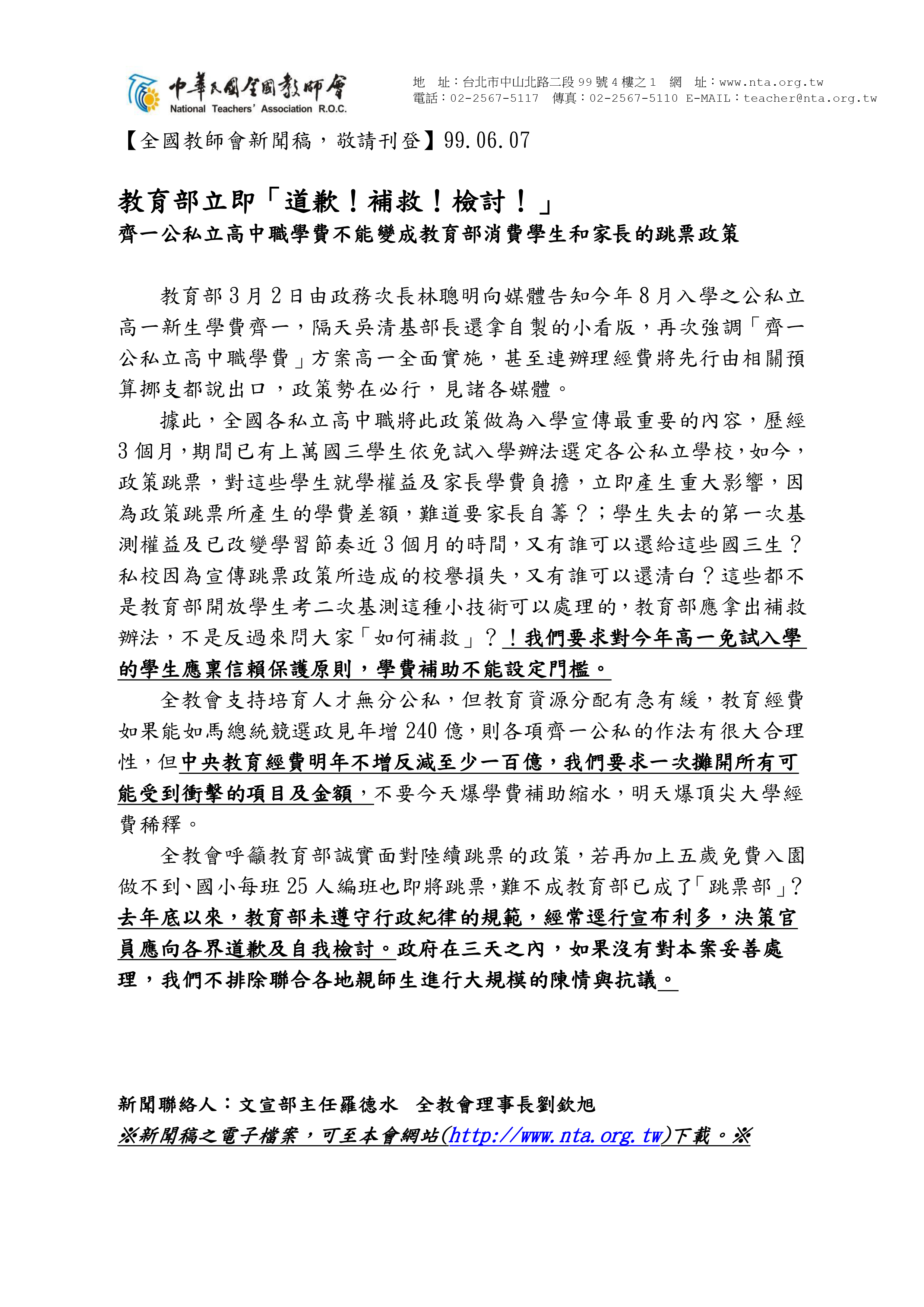 20100607【新聞稿】教育部立即「道歉!補救!檢討!」 齊一公私立高中職學費不能變成教育部消費學生和家長的跳票政策