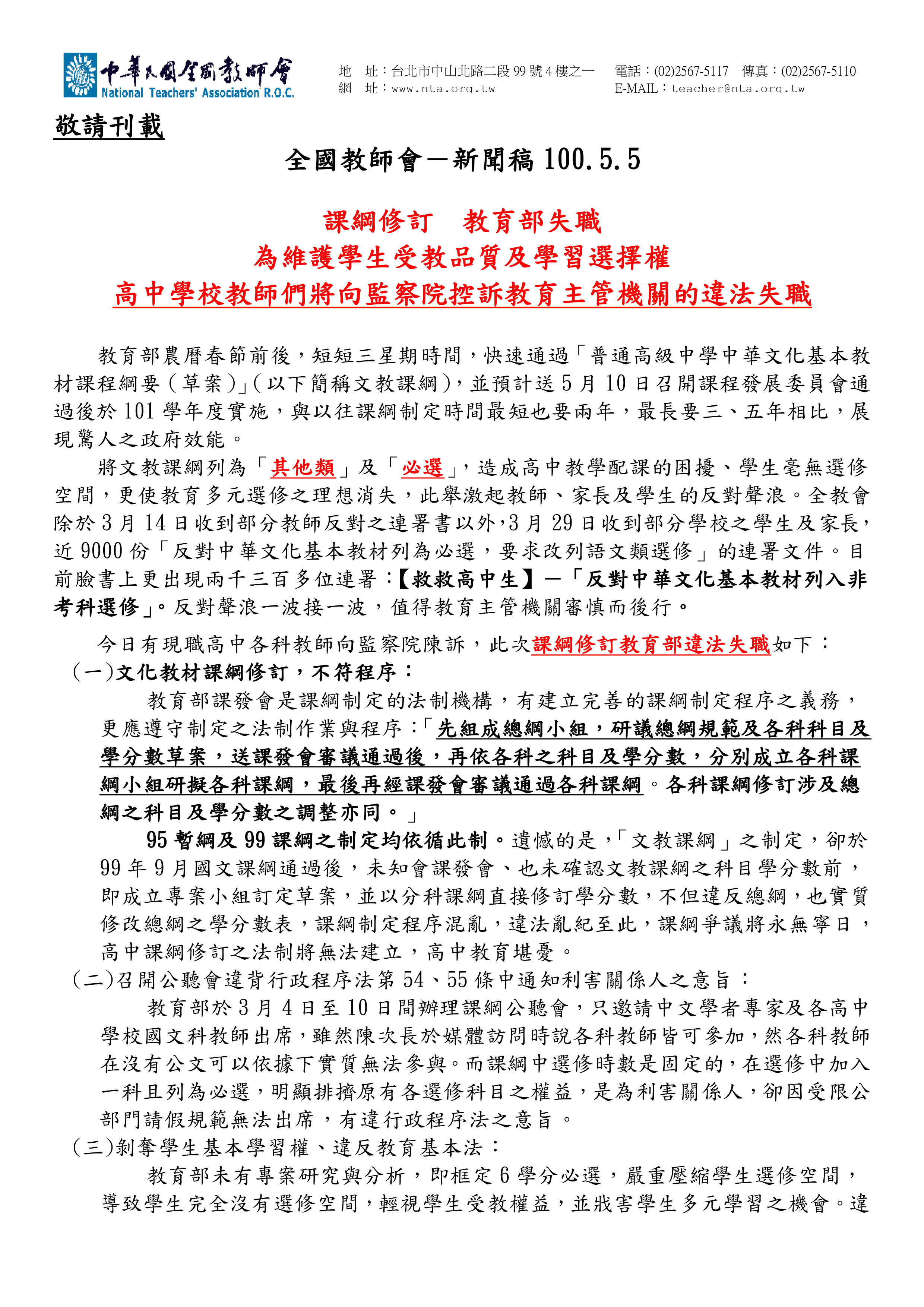 20110505【新聞稿】課綱修訂 教育部失職 為維護學生受教品質及學習選擇權 高中學校教師們將向監察院控訴教育主管機關的違法失職